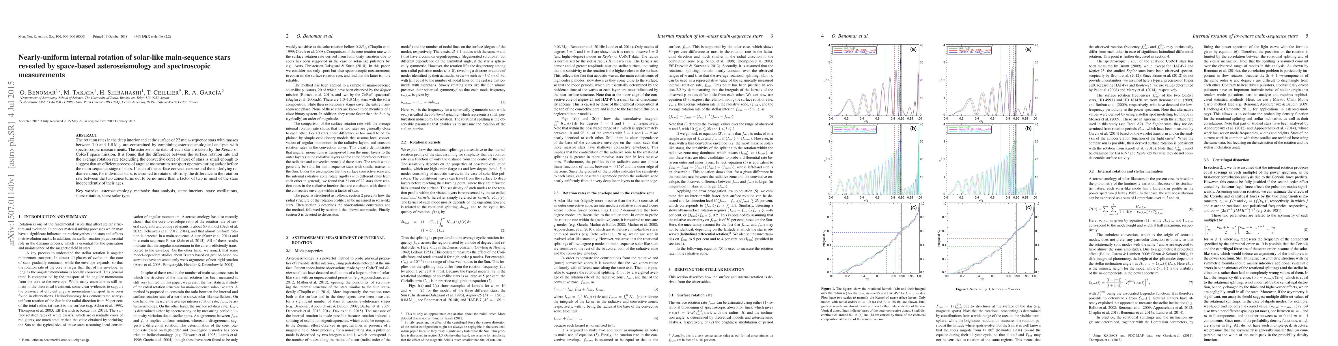 This study combines asteroseismology from the Kepler or CoRoT missions with spectroscopic measurements to determine the rotation rates of 22 solar-like main-sequence stars. The findings suggest nearly uniform internal rotation, indicating efficient angular momentum transport during and before the main-sequence stage.