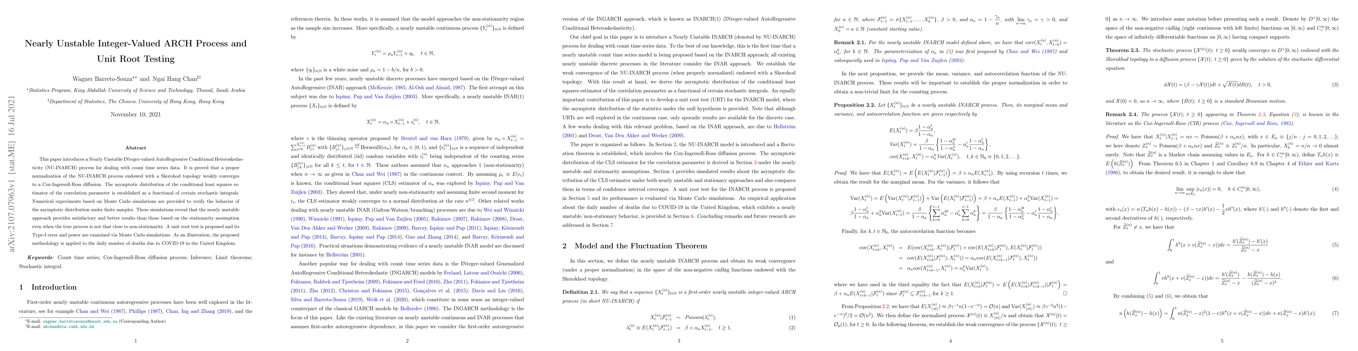 This paper introduces a Nearly Unstable INteger-valued AutoRegressive Conditional Heteroskedasticity (NU-INARCH) process for dealing with count time series data. It is proved that a proper normalization of the NU-INARCH process endowed with a Skorohod topology weakly converges to a Cox-Ingersoll-Ross diffusion. The asymptotic distribution of the conditional least squares estimator of the correlation parameter is established as a functional of certain stochastic integrals. Numerical experiments based on Monte Carlo simulations are provided to verify the behavior of the asymptotic distribution under finite samples. These simulations reveal that the nearly unstable approach provides satisfactory and better results than those based on the stationarity assumption even when the true process is not that close to non-stationarity. A unit root test is proposed and its Type-I error and power are examined via Monte Carlo simulations. As an illustration, the proposed methodology is applied to the daily number of deaths due to COVID-19 in the United Kingdom.
