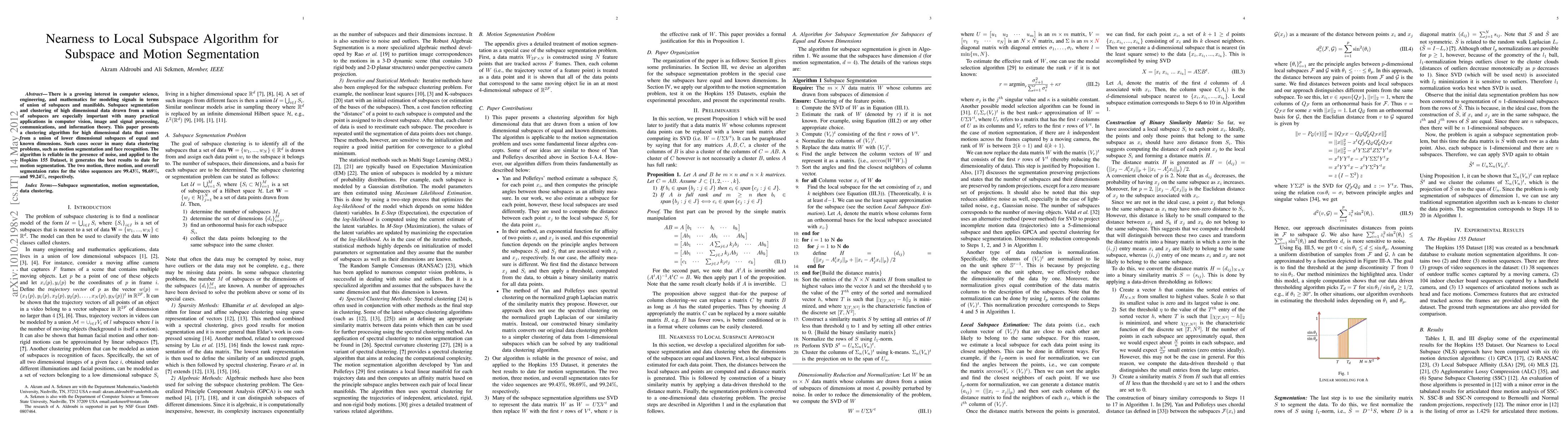 There is a growing interest in computer science, engineering, and mathematics for modeling signals in terms of union of subspaces and manifolds. Subspace segmentation and clustering of high dimensional data drawn from a union of subspaces are especially important with many practical applications in computer vision, image and signal processing, communications, and information theory. This paper presents a clustering algorithm for high dimensional data that comes from a union of lower dimensional subspaces of equal and known dimensions. Such cases occur in many data clustering problems, such as motion segmentation and face recognition. The algorithm is reliable in the presence of noise, and applied to the Hopkins 155 Dataset, it generates the best results to date for motion segmentation. The two motion, three motion, and overall segmentation rates for the video sequences are 99.43%, 98.69%, and 99.24%, respectively.