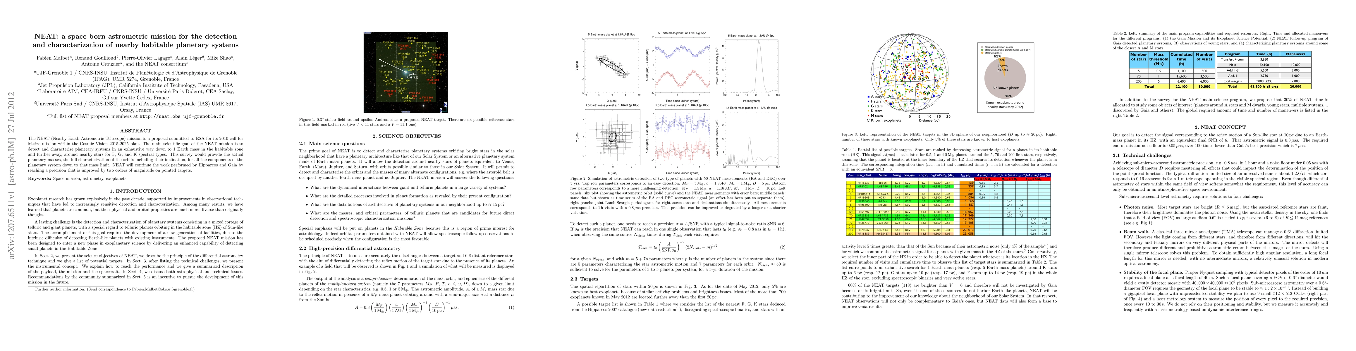 The NEAT mission aims to detect and characterize nearby habitable planetary systems with unprecedented precision, extending the work of Hipparcos and Gaia by achieving two orders of magnitude better accuracy on targeted systems. This astrometric survey will identify and fully characterize planetary orbits, including inclinations, for systems down to 1 Earth mass around F, G, and K spectral type stars.