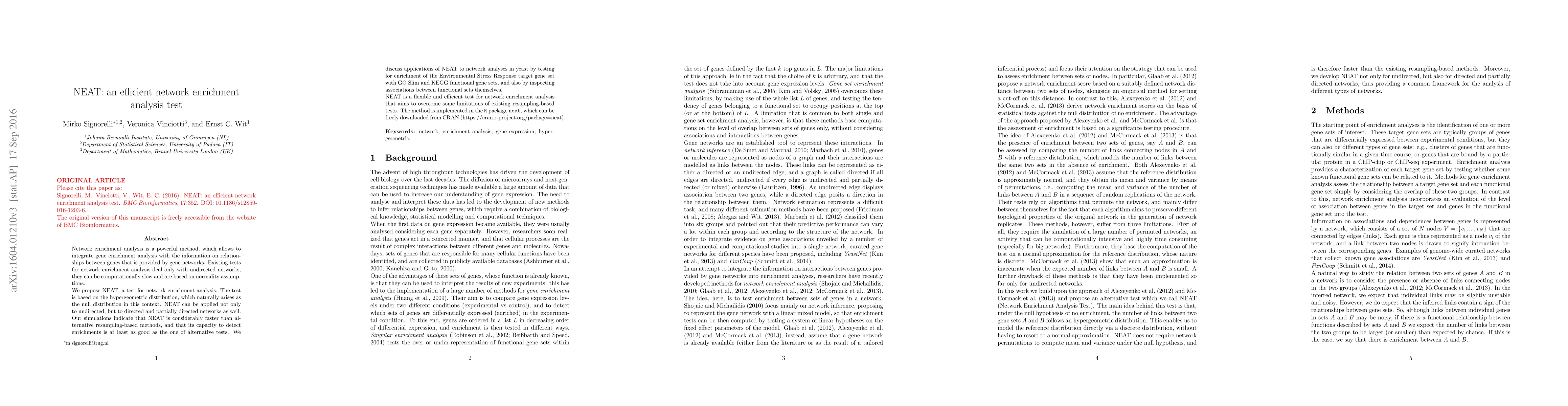 NEAT is a novel, efficient network enrichment analysis test based on the hypergeometric distribution, designed to handle directed and undirected gene networks. It outperforms existing resampling-based methods in speed and effectiveness, as demonstrated in yeast network analyses.