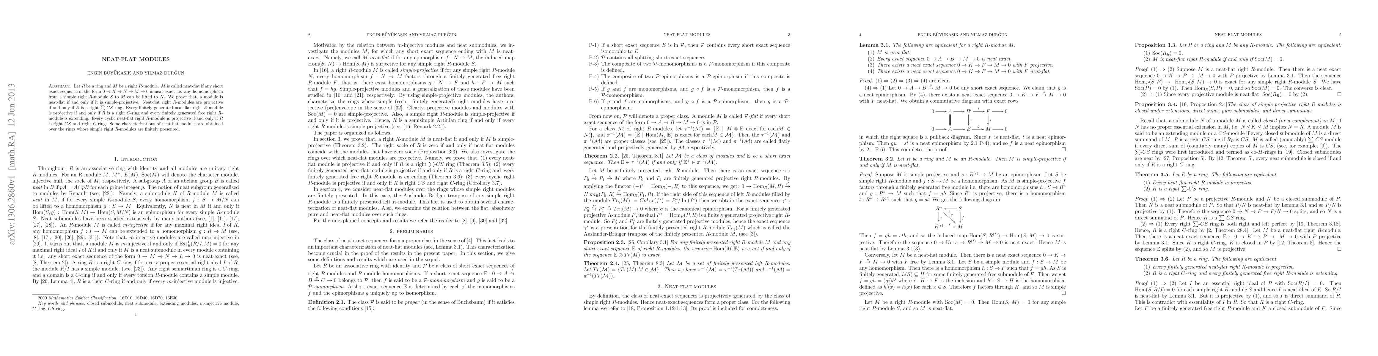 This paper introduces the concept of neat-flat modules, proving they are equivalent to simple-projective modules. It further explores conditions under which neat-flat modules are projective, notably relating it to properties of the ring $R$, such as being a right $\sum$-$CS$ ring or a right $C$-ring.