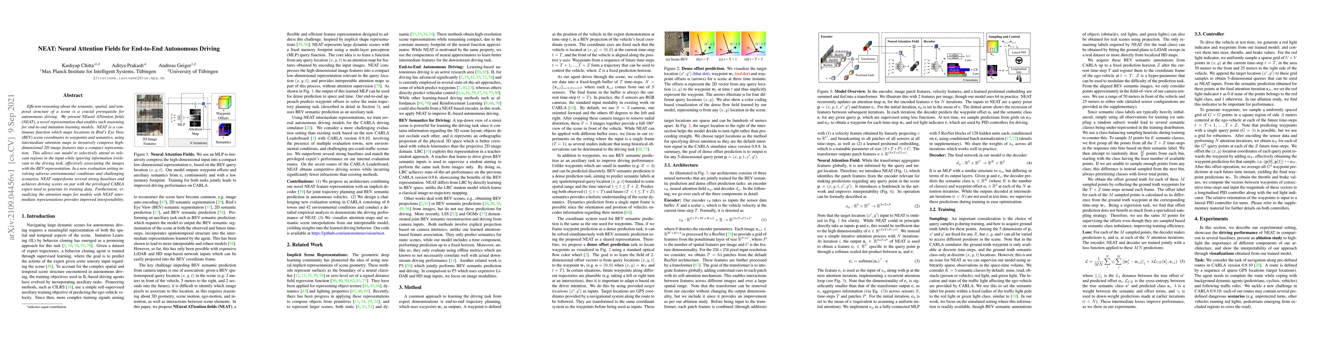 NEAT (NEural ATtention fields) is a novel representation for end-to-end autonomous driving models that maps BEV scene coordinates to waypoints and semantics using attention fields. It outperforms baselines in adverse conditions and offers improved interpretability through attention maps.