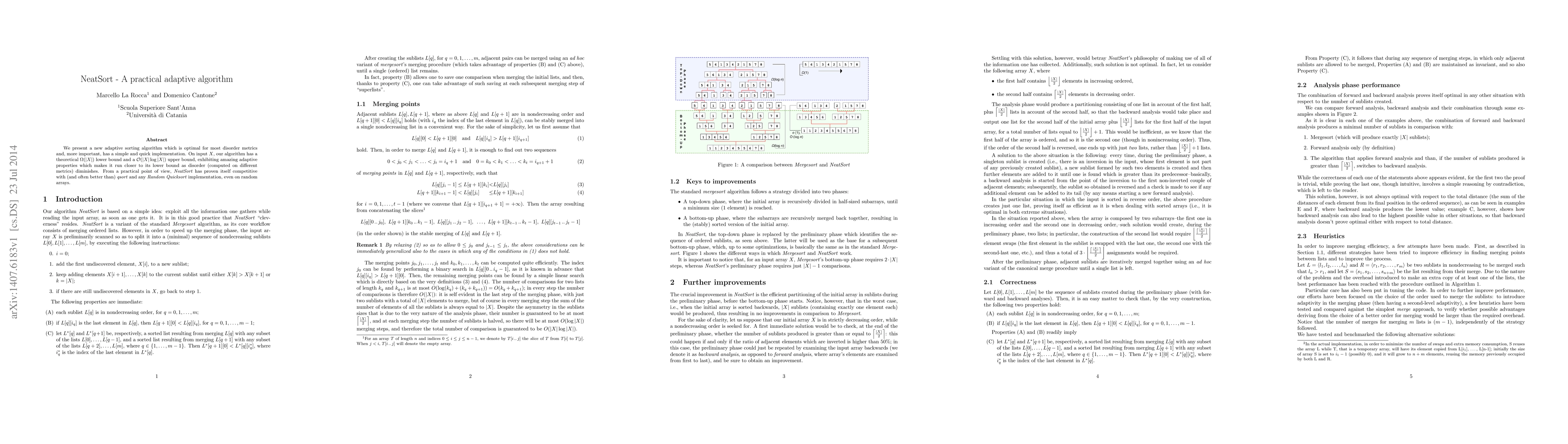 We present a new adaptive sorting algorithm which is optimal for most disorder metrics and, more important, has a simple and quick implementation. On input $X$, our algorithm has a theoretical $\Omega (|X|)$ lower bound and a $\mathcal{O}(|X|\log|X|)$ upper bound, exhibiting amazing adaptive properties which makes it run closer to its lower bound as disorder (computed on different metrics) diminishes. From a practical point of view, \textit{NeatSort} has proven itself competitive with (and often better than) \textit{qsort} and any \textit{Random Quicksort} implementation, even on random arrays.