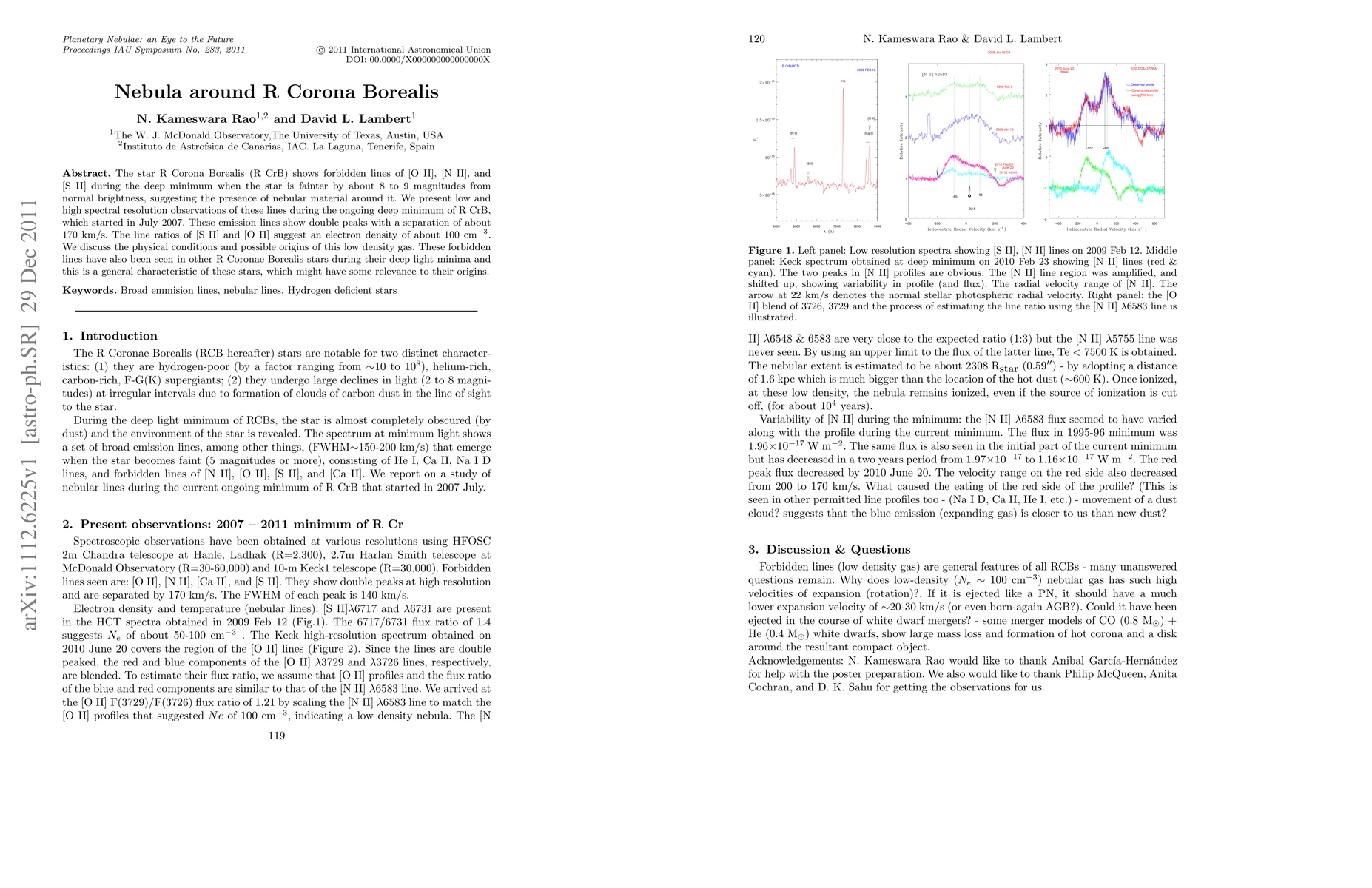 The research observes R Corona Borealis (R CrB) during its deep minimum, revealing double-peaked emission lines of [O II], [N II], and [S II] at approximately 170 km/s separation, indicating nebular material around the star. The electron density is estimated at 100 cm$^{-3}$. This phenomenon, also seen in other R Coronae Borealis stars, may hold clues to their origins.