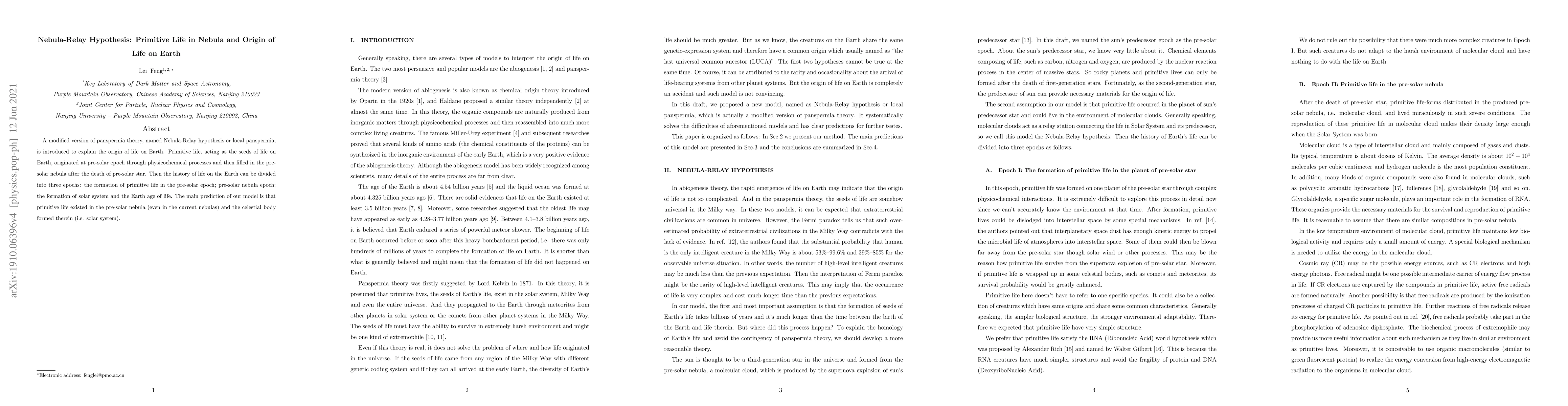 The Nebula-Relay Hypothesis proposes a modified panspermia theory where primitive life originated in pre-solar nebulas and seeded Earth, suggesting three epochs in Earth's life history: pre-solar origin, pre-solar nebula phase, and solar system formation. The hypothesis predicts the existence of primitive life in current nebulas and celestial bodies.