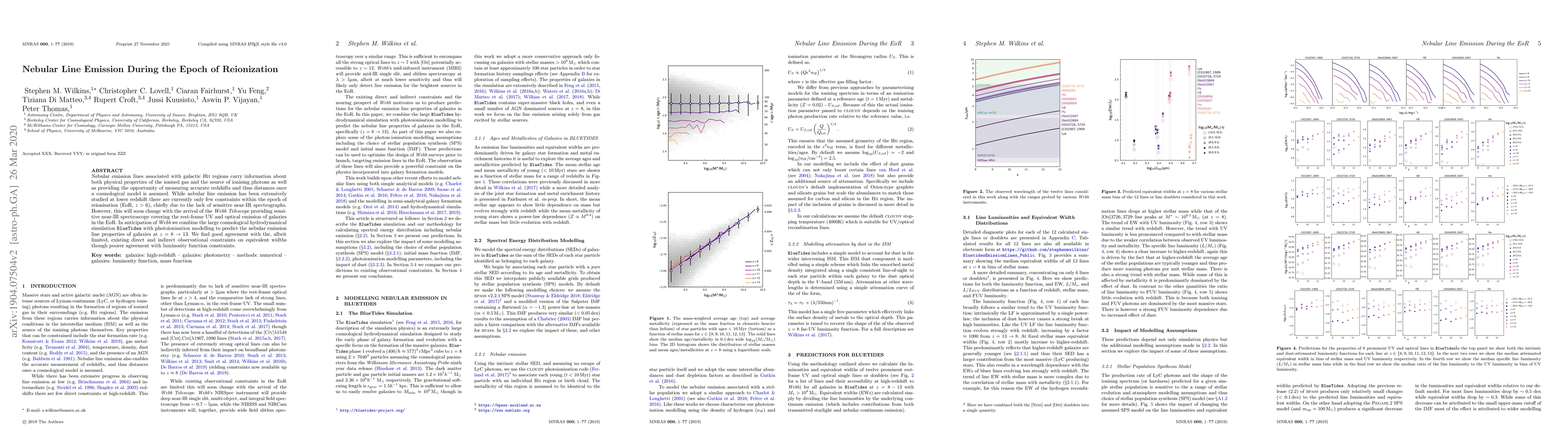 This paper combines cosmological simulations with photoionisation modelling to predict nebular emission line properties of galaxies during the epoch of reionization ($z=8\to 13$), anticipating the capabilities of the Webb Telescope. It finds good agreement with existing observational constraints on equivalent widths but less so with luminosity function data.