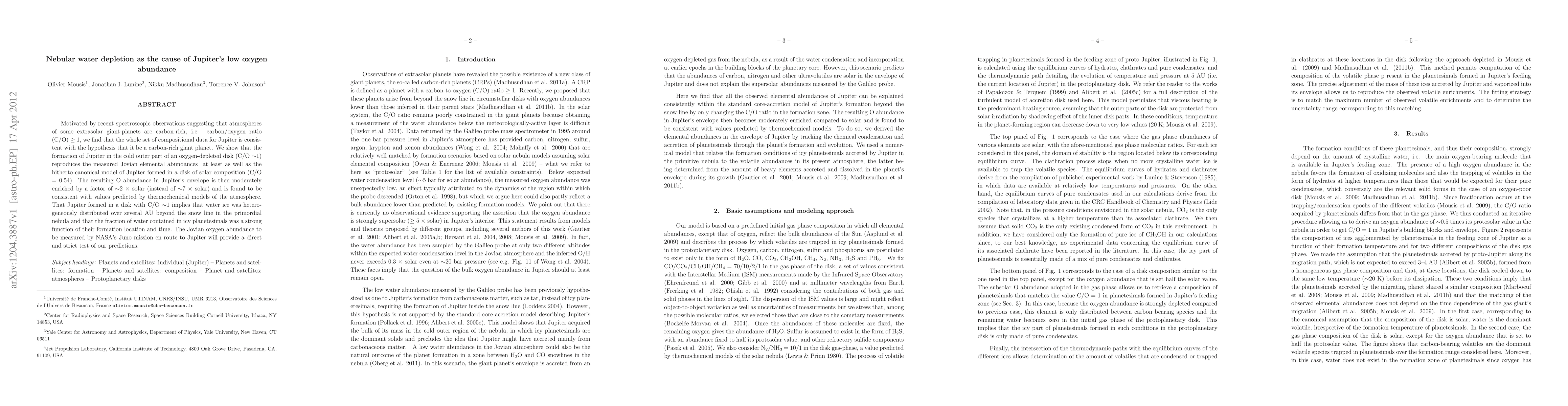 Researchers suggest Jupiter's low oxygen abundance may be due to formation in an oxygen-depleted disk with a carbon-rich composition, contradicting the traditional model of its formation.