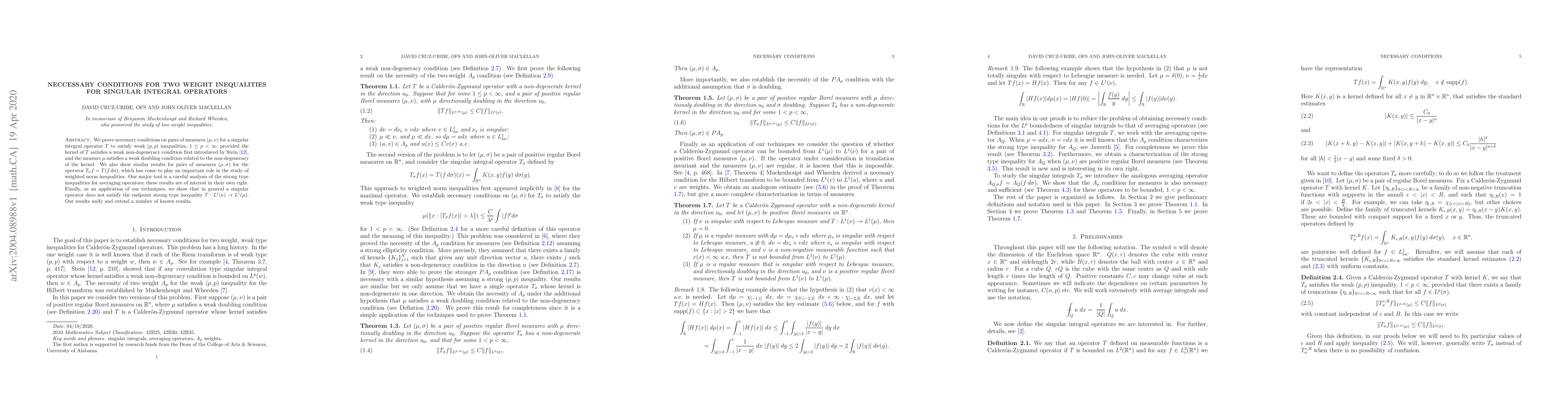 This paper proves necessary conditions for singular integral operators to satisfy two weight inequalities, extending and unifying known results, while also highlighting the limitation of such operators at achieving endpoint strong type inequality.
