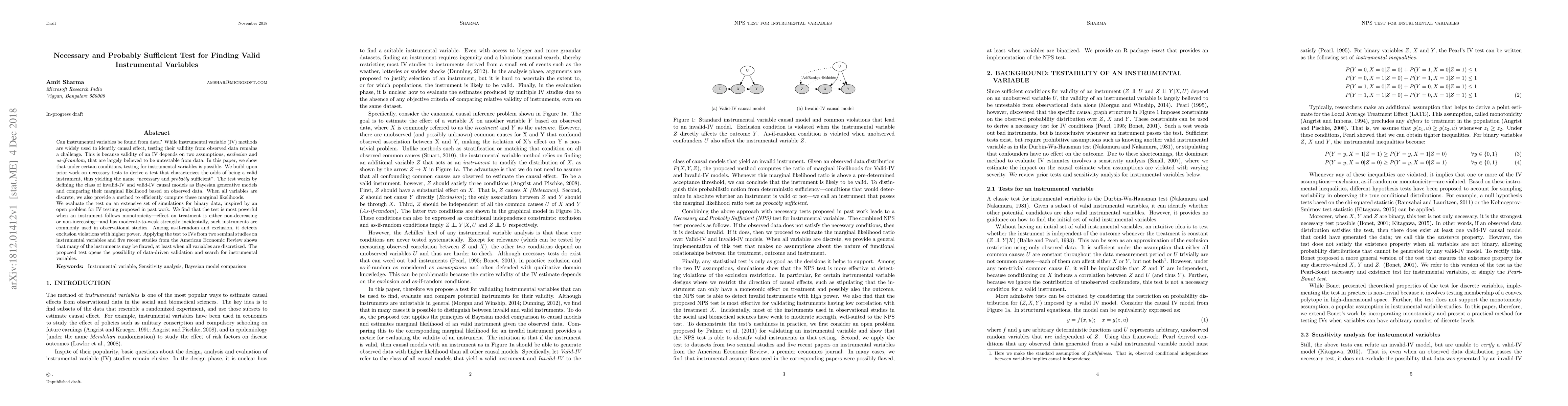 Can instrumental variables be found from data? While instrumental variable (IV) methods are widely used to identify causal effect, testing their validity from observed data remains a challenge. This is because validity of an IV depends on two assumptions, exclusion and as-if-random, that are largely believed to be untestable from data. In this paper, we show that under certain conditions, testing for instrumental variables is possible. We build upon prior work on necessary tests to derive a test that characterizes the odds of being a valid instrument, thus yielding the name "necessary and probably sufficient". The test works by defining the class of invalid-IV and valid-IV causal models as Bayesian generative models and comparing their marginal likelihood based on observed data. When all variables are discrete, we also provide a method to efficiently compute these marginal likelihoods. We evaluate the test on an extensive set of simulations for binary data, inspired by an open problem for IV testing proposed in past work. We find that the test is most powerful when an instrument follows monotonicity---effect on treatment is either non-decreasing or non-increasing---and has moderate-to-weak strength; incidentally, such instruments are commonly used in observational studies. Among as-if-random and exclusion, it detects exclusion violations with higher power. Applying the test to IVs from two seminal studies on instrumental variables and five recent studies from the American Economic Review shows that many of the instruments may be flawed, at least when all variables are discretized. The proposed test opens the possibility of data-driven validation and search for instrumental variables.