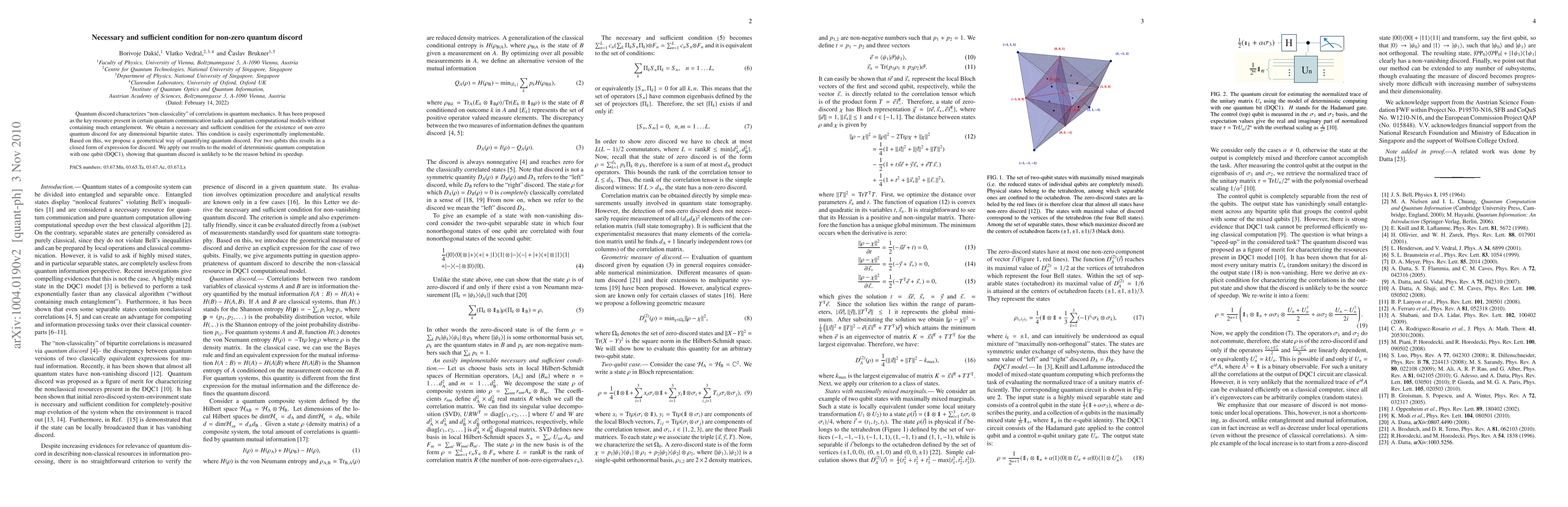 This paper establishes a necessary and sufficient condition for non-zero quantum discord in any dimensional bipartite states, providing an easily implementable experimental criterion. It also proposes a geometrical method for quantifying discord, resulting in a closed-form expression for two qubits, and concludes that quantum discord is unlikely to be the cause of speedup in deterministic quantum computation with one qubit.