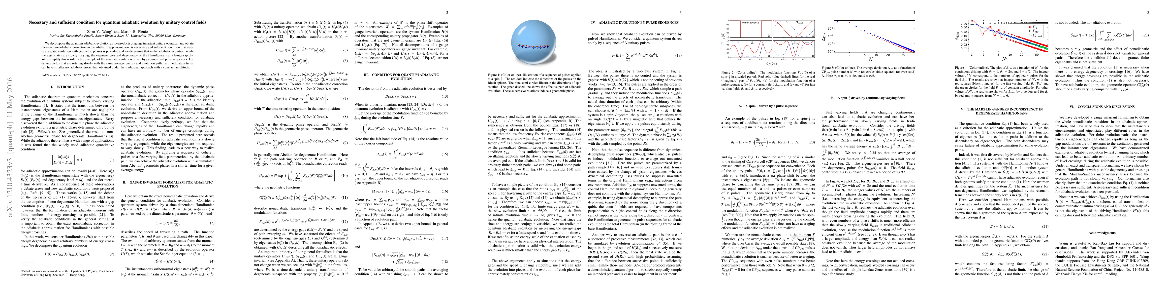 This paper establishes a necessary and sufficient condition for quantum adiabatic evolution using unitary control fields, showing that geometric phases can be achieved. It demonstrates that while eigenstates vary slowly, eigenenergies and Hamiltonian degeneracy can change rapidly, and it finds that fast modulation fields can reduce nonadiabatic errors compared to constant amplitude fields.