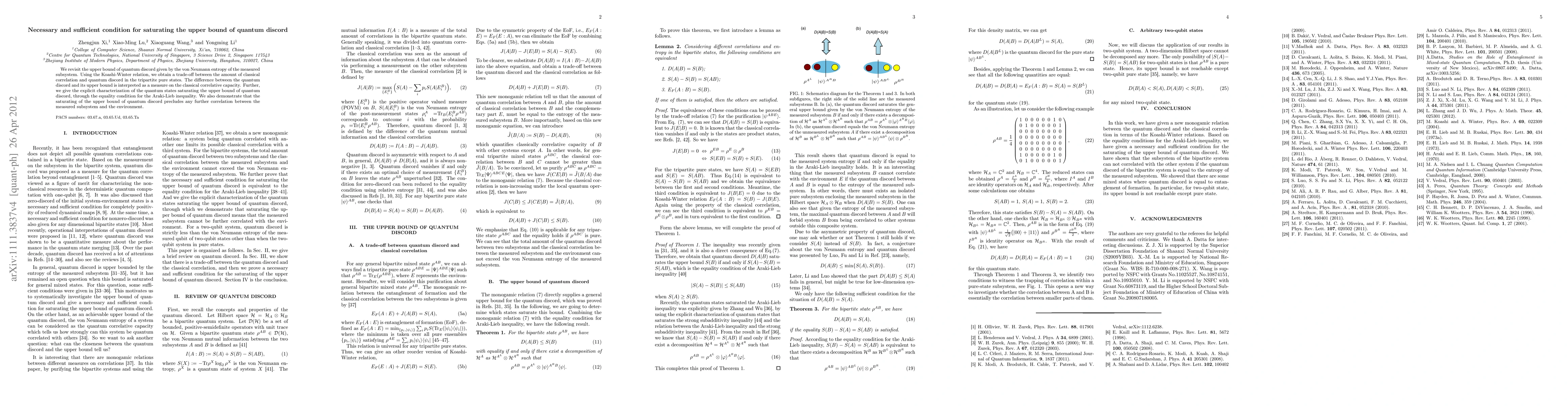 This paper establishes a necessary and sufficient condition for quantum states to saturate the upper bound of quantum discord, showing that it occurs when the Araki-Lieb inequality holds as an equality. It also reveals that such saturation eliminates any additional correlation between the measured subsystem and its environment.