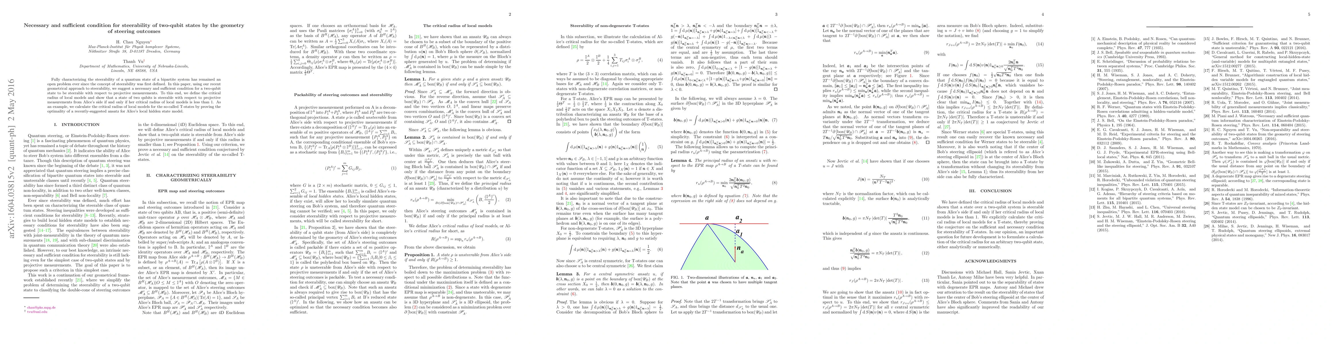 This paper proposes a necessary and sufficient condition for the steerability of two-qubit quantum states based on a geometrical approach, showing that a state is steerable if Alice's critical radius of local models is less than $1$. It also demonstrates the optimality of a specific ansatz for Alice's local hidden state model using T-states as an example.