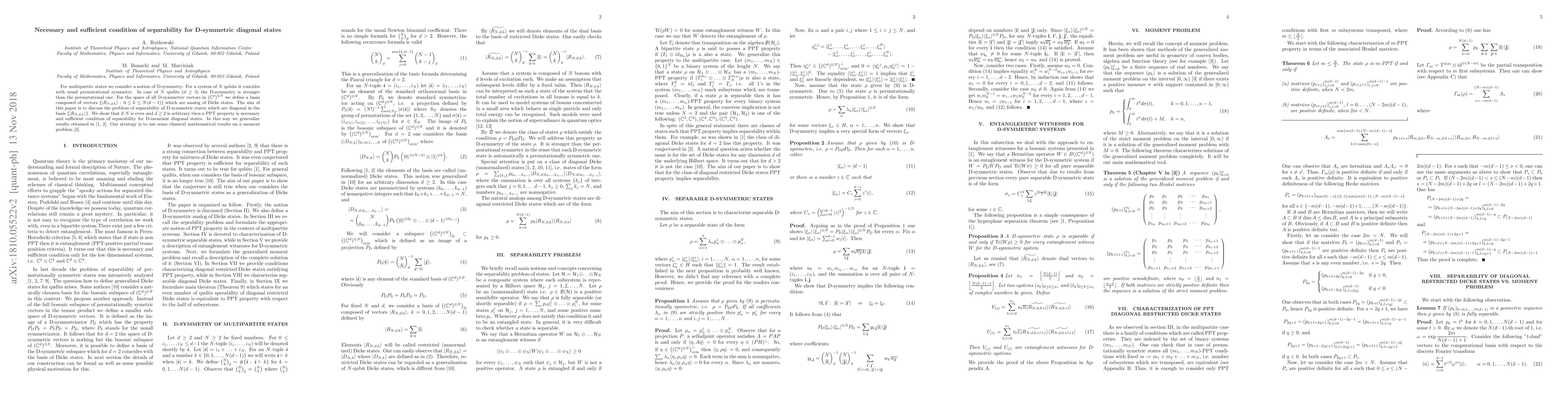 This paper investigates the separability of D-symmetric diagonal states in multipartite quantum systems, showing that for even numbers of qubits or qudits, the Peres-Horodecki (PPT) property is both necessary and sufficient for separability. The authors generalize previous results for qubits to qudits using classical mathematical results on moment problems.