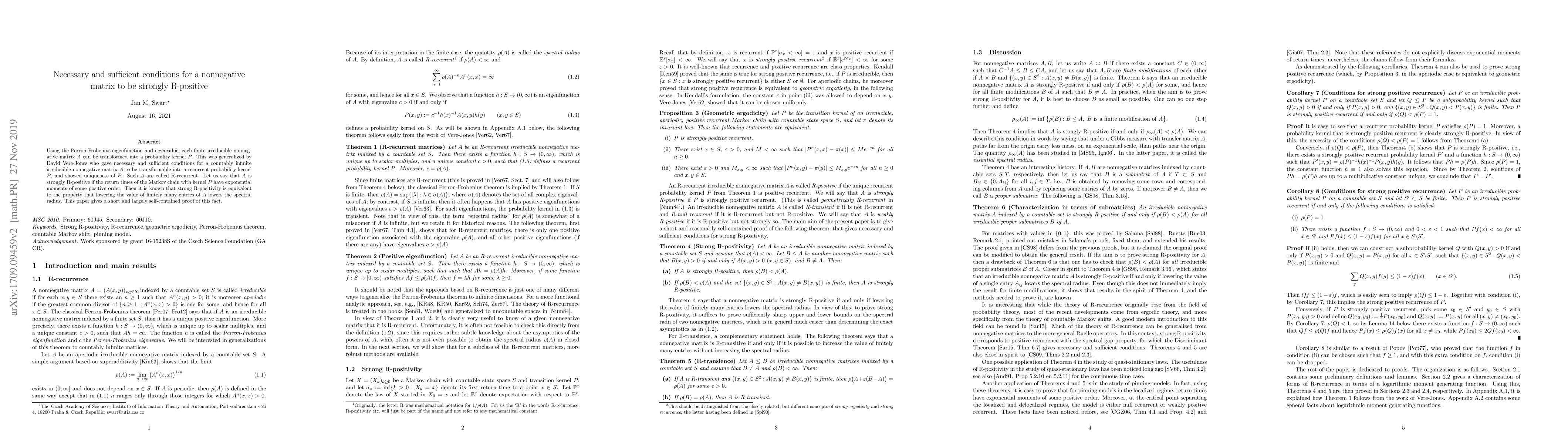 Using the Perron-Frobenius eigenfunction and eigenvalue, each finite irreducible nonnegative matrix $A$ can be transformed into a probability kernel $P$. This was generalized by David Vere-Jones who gave necessary and sufficient conditions for a countably infinite irreducible nonnegative matrix $A$ to be transformable into a recurrent probability kernel $P$, and showed uniqueness of $P$. Such $A$ are called R-recurrent. Let us say that $A$ is strongly R-positive if the return times of the Markov chain with kernel $P$ have exponential moments of some positive order. Then it is known that strong R-positivity is equivalent to the property that lowering the value of finitely many entries of $A$ lowers the spectral radius. This paper gives a short and largely self-contained proof of this fact.