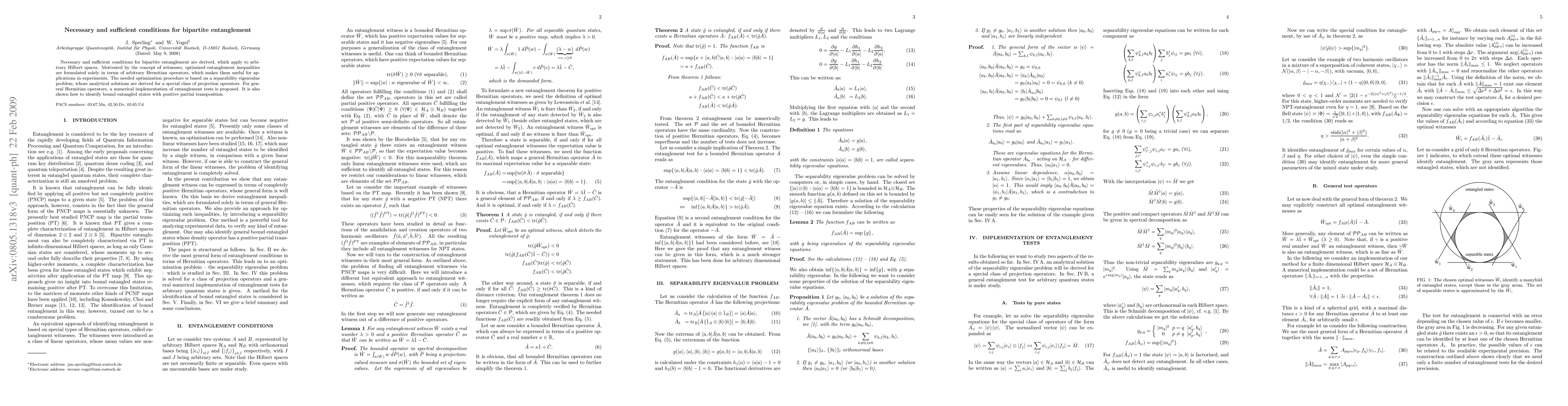 Summary: The paper derives necessary and sufficient conditions for bipartite entanglement applicable to any Hilbert space, utilizing optimized entanglement inequalities based on Hermitian operators. It presents an analytical solution for a separability eigenvalue problem for a specific class of projection operators and proposes a numerical approach for general Hermitian operators, also identifying bound entangled states with positive partial transposition.