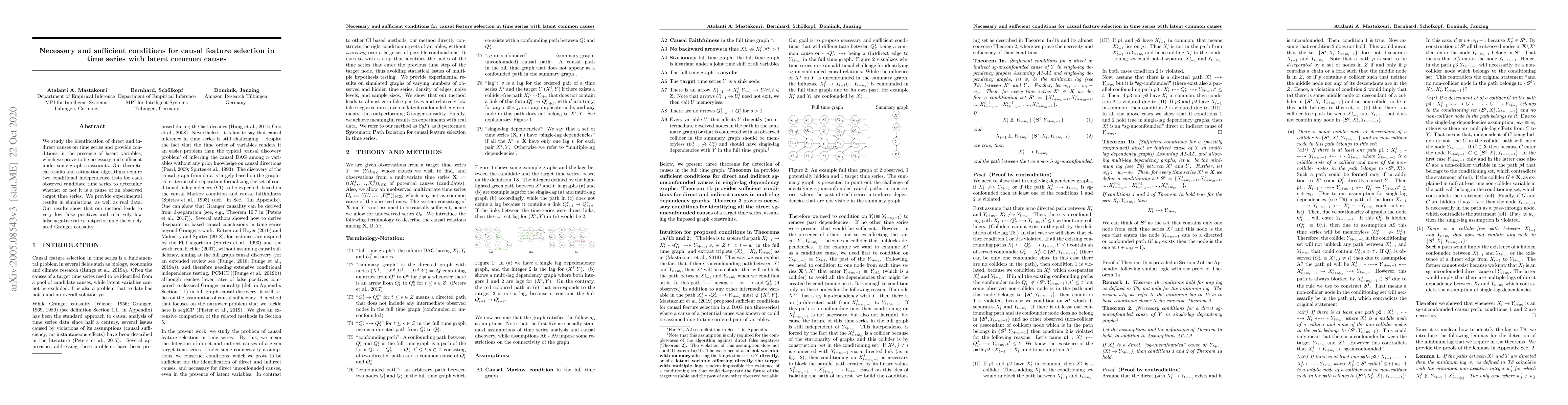 We study the identification of direct and indirect causes on time series and provide conditions in the presence of latent variables, which we prove to be necessary and sufficient under some graph constraints. Our theoretical results and estimation algorithms require two conditional independence tests for each observed candidate time series to determine whether or not it is a cause of an observed target time series. We provide experimental results in simulations, as well as real data. Our results show that our method leads to very low false positives and relatively low false negative rates, outperforming the widely used Granger causality.