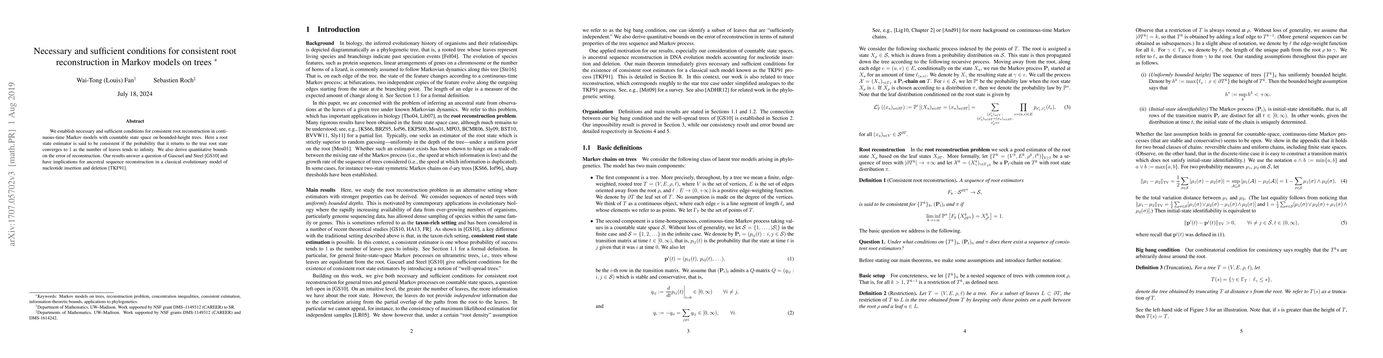 This paper provides necessary and sufficient conditions for consistent root state reconstruction in continuous-time Markov models on bounded-height trees, establishing quantitative bounds on reconstruction error and addressing a question posed by Gascuel and Steel, with implications for ancestral sequence reconstruction in evolutionary models.