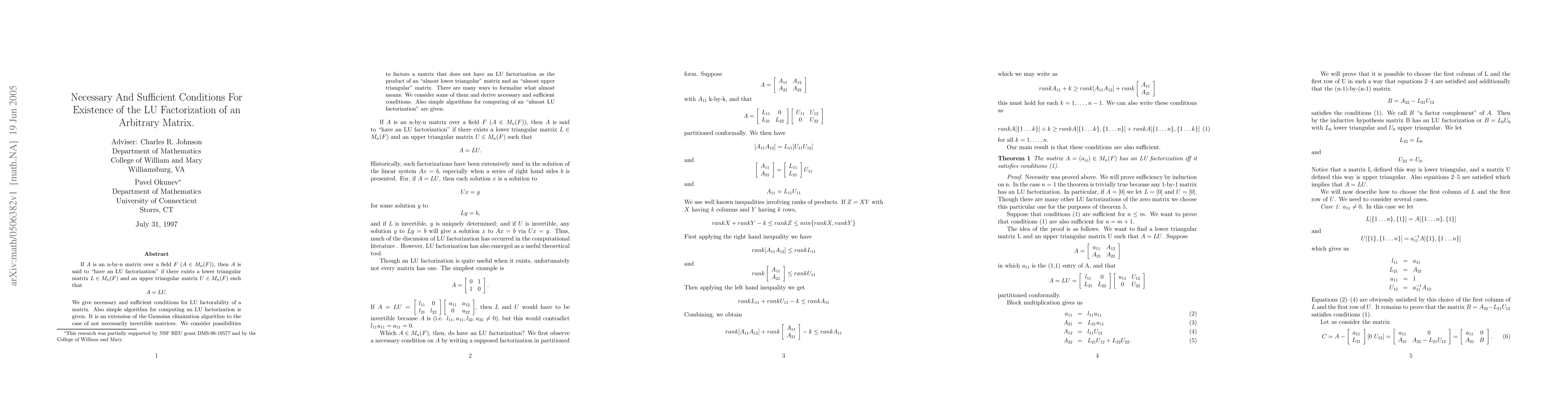 If $A$ is an n-by-n matrix over a field $F$ ($A\in M_{n}(F)$), then $A$ is said to ``have an LU factorization'' if there exists a lower triangular matrix $L\in M_{n}(F)$ and an upper triangular matrix $U\in M_{n}(F)$ such that $$A=LU.$$ We give necessary and sufficient conditions for LU factorability of a matrix. Also simple algorithm for computing an LU factorization is given. It is an extension of the Gaussian elimination algorithm to the case of not necessarily invertible matrices. We consider possibilities to factors a matrix that does not have an LU factorization as the product of an ``almost lower triangular'' matrix and an ``almost upper triangular'' matrix. There are many ways to formalize what almost means. We consider some of them and derive necessary and sufficient conditions. Also simple algorithms for computing of an ``almost LU factorization'' are given.