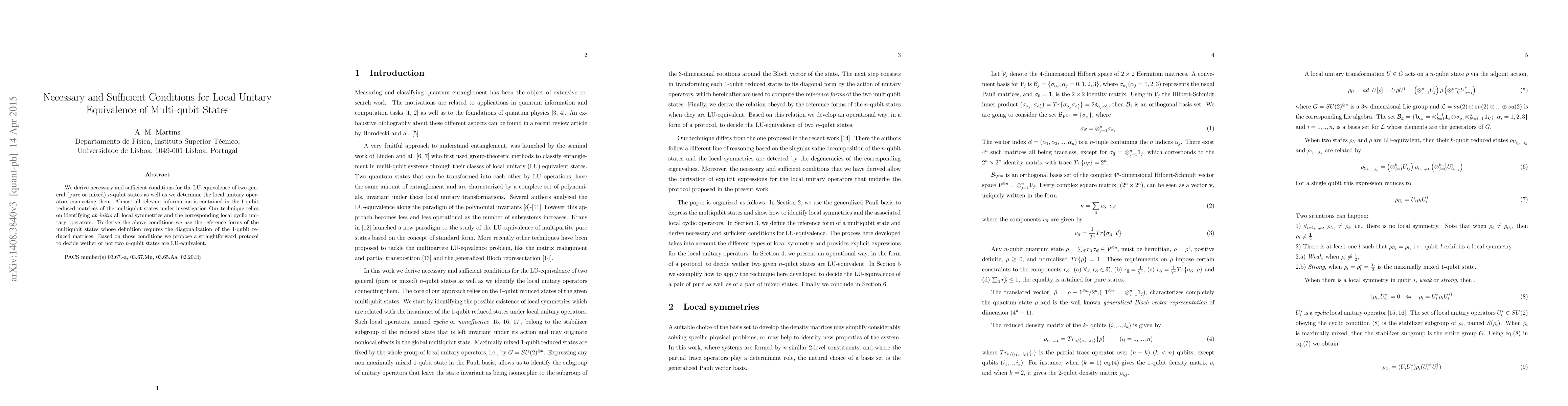 This paper derives necessary and sufficient conditions for local unitary equivalence of general $n$-qubit states, identifying local symmetries and cyclic unitary operators. It proposes a protocol based on the diagonalization of 1-qubit reduced matrices to determine if two $n$-qubit states are locally unitarily equivalent.