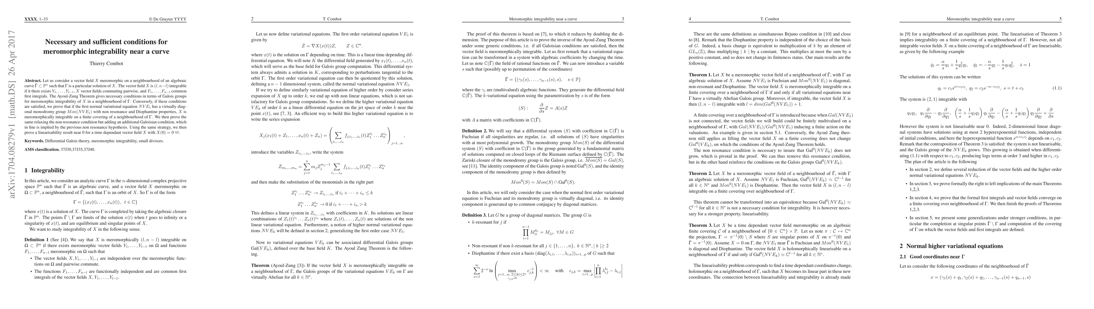 Let us consider a vector field $X$ meromorphic on a neighbourhood of an algebraic curve $\bar{\Gamma}\subset \mathbb{P}^n$ such that $\Gamma$ is a particular solution of $X$. The vector field $X$ is $(l,n-l)$ integrable if it there exists $Y_1,\dots,Y_{l-1},X$ vector fields commuting pairwise, and $F_1,\dots,F_{n-l}$ common first integrals. The Ayoul-Zung Theorem gives necessary conditions in terms of Galois groups for meromorphic integrability of $X$ in a neighbourhood of $\Gamma$. Conversely, if these conditions are satisfied, we prove that if the first normal variational equation $NVE_1$ has a virtually diagonal monodromy group $Mon(NVE_1)$ with non resonance and Diophantine properties, $X$ is meromorphically integrable on a finite covering of a neighbourhood of $\Gamma$. We then prove the same relaxing the non resonance condition but adding an additional Galoisian condition, which in fine is implied by the previous non resonance hypothesis. Using the same strategy, we then prove a linearisability result near $0$ for a time dependant vector field $X$ with $X(0)=0\;\forall t$.