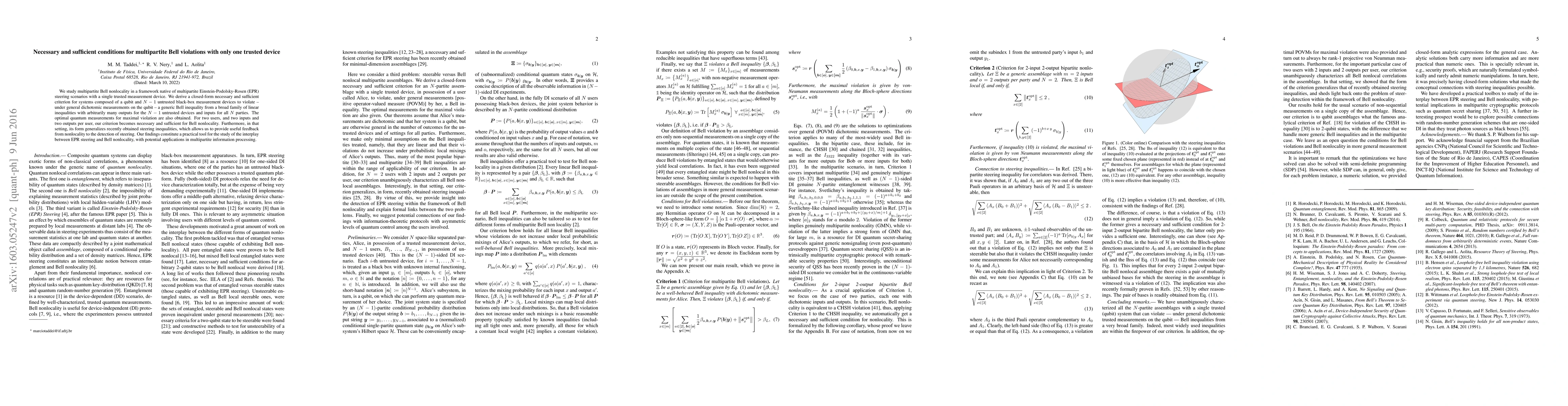This paper derives a necessary and sufficient condition for multipartite Bell violations using a single trusted measurement device, providing a closed-form criterion for qubit and N-1 untrusted devices. It also identifies optimal quantum measurements for maximal violation and generalizes steering inequalities for practical applications in multipartite information processing.