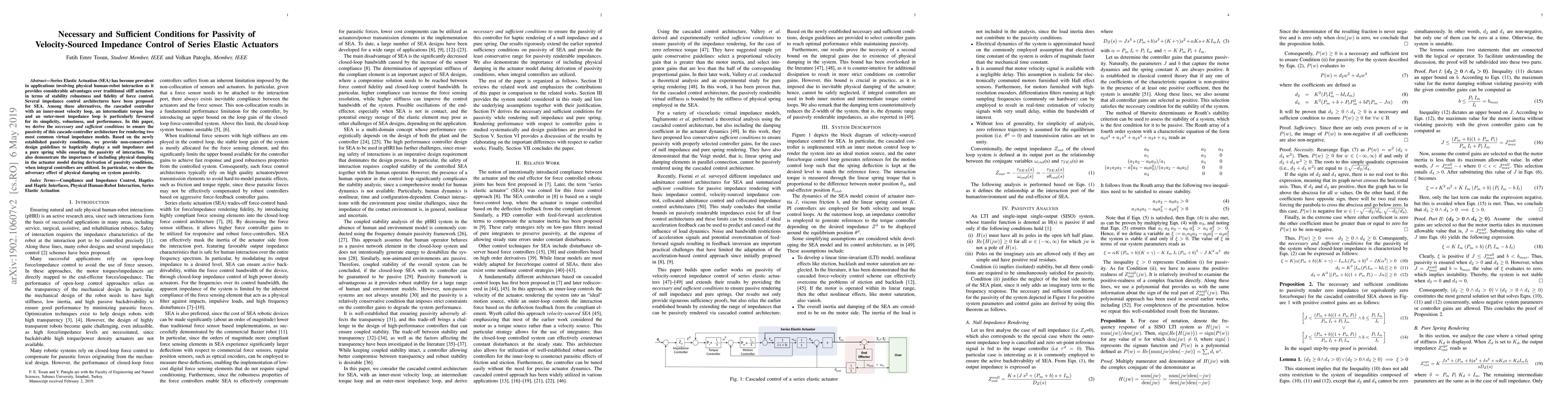 Series Elastic Actuation (SEA) has become prevalent in applications involving physical human-robot interaction as it provides considerable advantages over traditional stiff actuators in terms of stability robustness and fidelity of force control. Several impedance control architectures have been proposed for SEA. Among these alternatives, the cascaded controller with an inner-most velocity loop, an intermediate torque loop and an outer-most impedance loop is particularly favoured for its simplicity, robustness, and performance. In this paper, we derive the \emph{necessary and sufficient conditions} to ensure the passivity of this cascade-controller architecture for rendering two most common virtual impedance models. Based on the newly established passivity conditions, we provide non-conservative design guidelines to haptically display a null impedance and a pure spring while ensuring the passivity of interaction. We also demonstrate the importance of including physical damping in the actuator model during derivation of passivity conditions, when integral controllers are utilized. In particular, we show the adversary effect of physical damping on system passivity.