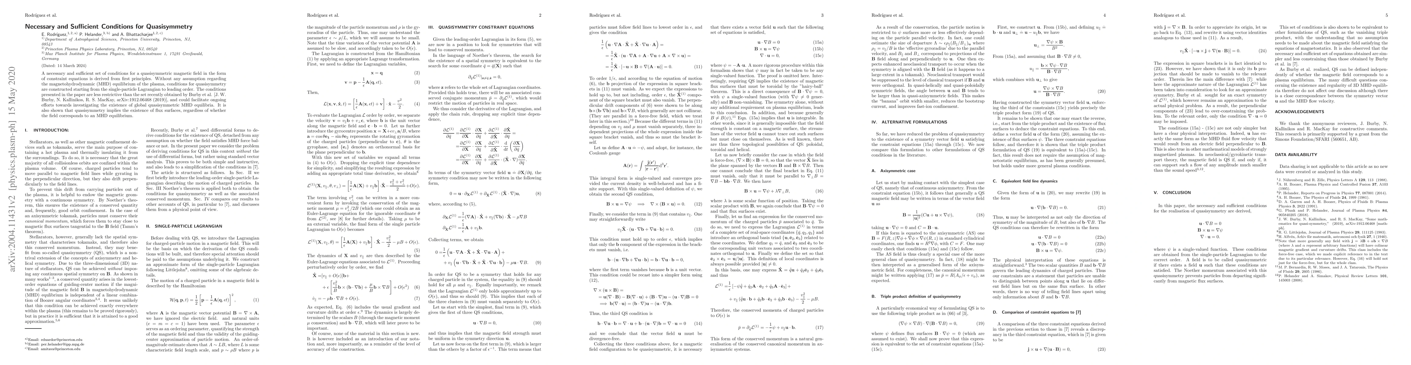 A necessary and sufficient set of conditions for a quasisymmetric magnetic field in the form of constraint equations is derived from first principles. Without any assumption regarding the magnetohydrodynamic (MHD) equilibrium of the plasma, conditions for quasisymmetry are constructed starting from the single-particle Lagrangian to leading order. The conditions presented in the paper are less restrictive than the set recently obtained by Burby et al. [arXiv:1912.06468], and could facilitate ongoing efforts towards investigating the existence of global quasisymmetric MHD equilibria. It is also shown that quasisymmetry implies the existence of flux surfaces, regardless of whether the field corresponds to an MHD equilibrium.