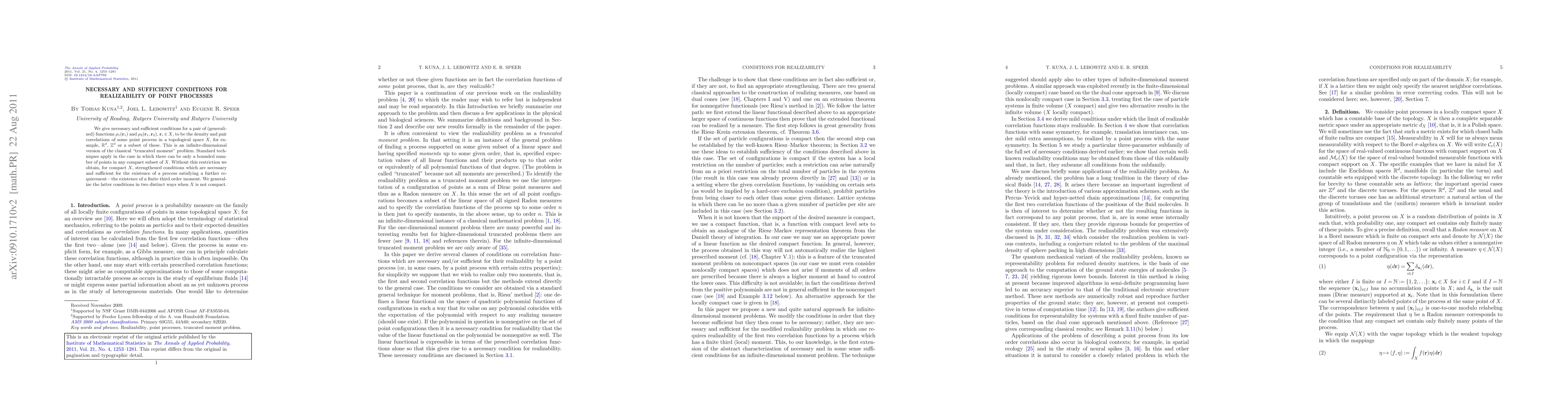 We give necessary and sufficient conditions for a pair of (generalized) functions $\rho_1(\mathbf{r}_1)$ and $\rho_2(\mathbf{r}_1,\mathbf{r}_2)$, $\mathbf{r}_i\in X$, to be the density and pair correlations of some point process in a topological space $X$, for example, $\mathbb {R}^d$, $\mathbb {Z}^d$ or a subset of these. This is an infinite-dimensional version of the classical "truncated moment" problem. Standard techniques apply in the case in which there can be only a bounded number of points in any compact subset of $X$. Without this restriction we obtain, for compact $X$, strengthened conditions which are necessary and sufficient for the existence of a process satisfying a further requirement---the existence of a finite third order moment. We generalize the latter conditions in two distinct ways when $X$ is not compact.