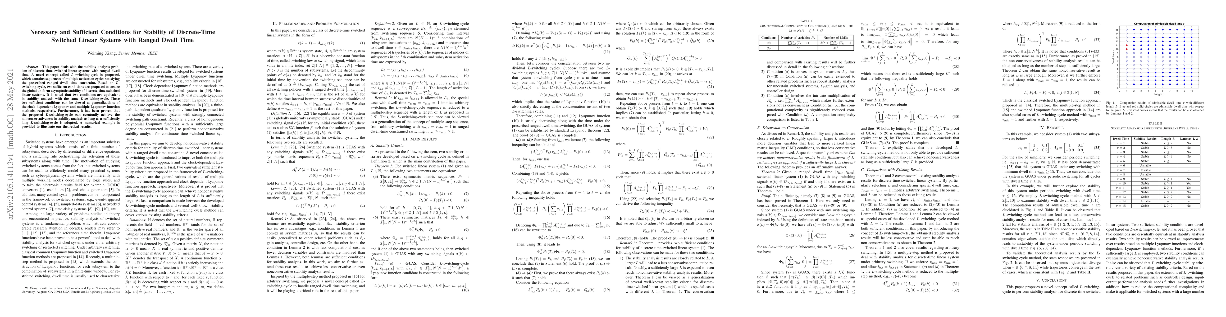 This paper proposes L-switching-cycles to analyze stability in discrete-time switched linear systems with ranged dwell time, presenting two sufficient conditions for global uniform asymptotic stability. The conditions generalize existing Lyapunov-based methods and demonstrate improved nonconservativeness with longer cycles.