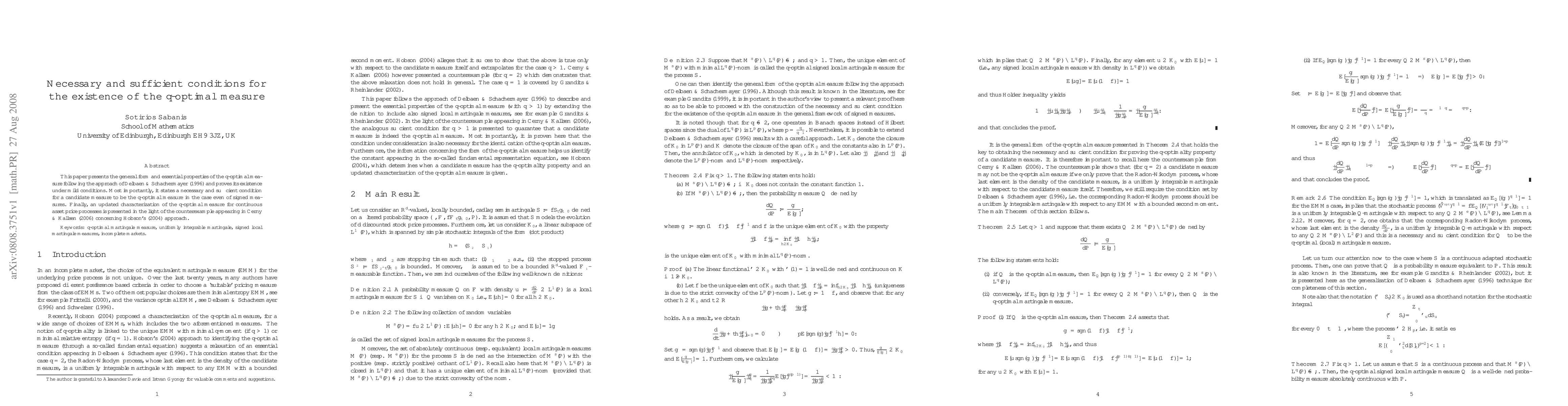 This paper establishes the existence of the q-optimal measure under mild conditions and provides a necessary and sufficient condition for its identification, even for signed measures. It also updates the characterization of the q-optimal measure for continuous asset price processes, addressing previous counterexamples.