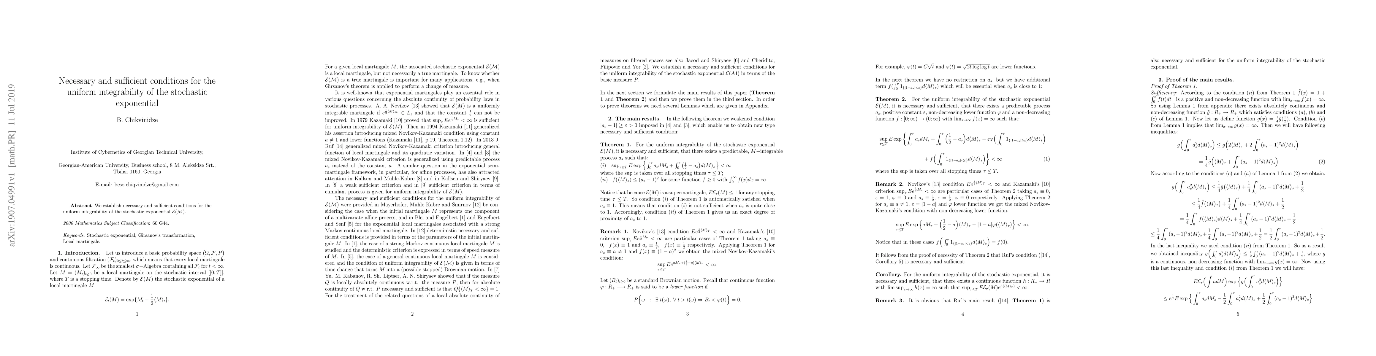 Summary: This paper provides both necessary and sufficient conditions for the uniform integrability of the stochastic exponential E(M), a crucial property in the study of stochastic processes. The findings enhance the understanding of the behavior and convergence of such exponential processes.