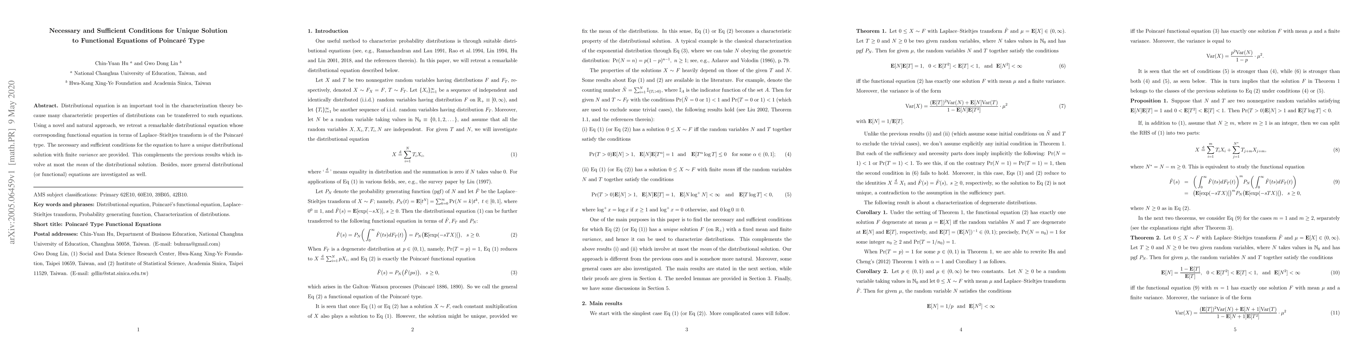 Distributional equation is an important tool in the characterization theory because many characteristic properties of distributions can be transferred to such equations. Using a novel and natural approach, we retreat a remarkable distributional equation whose corresponding functional equation in terms of Laplace-Stieltjes transform is of the Poincare type. The necessary and sufficient conditions for the equation to have a unique distributional solution with finite variance are provided. This complements the previous results which involve at most the mean of the distributional solution. Besides, more general distributional (or functional) equations are investigated as well.
