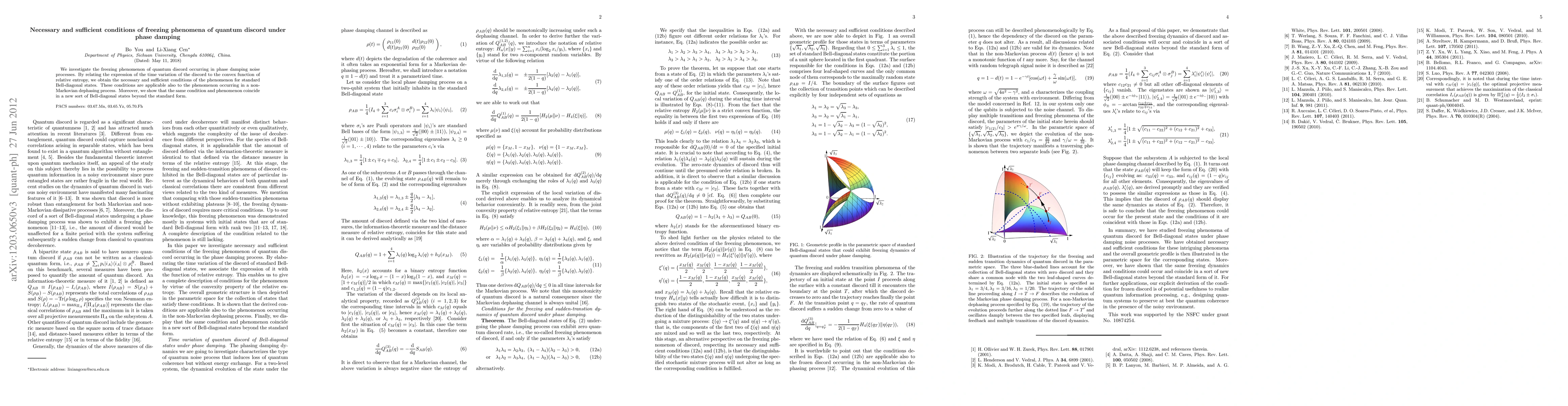 This paper investigates the freezing phenomenon of quantum discord in phase damping noise, deriving necessary and sufficient conditions for standard Bell-diagonal states. It also extends these findings to non-Markovian dephasing processes and identifies a new class of Bell-diagonal states where the phenomenon occurs.