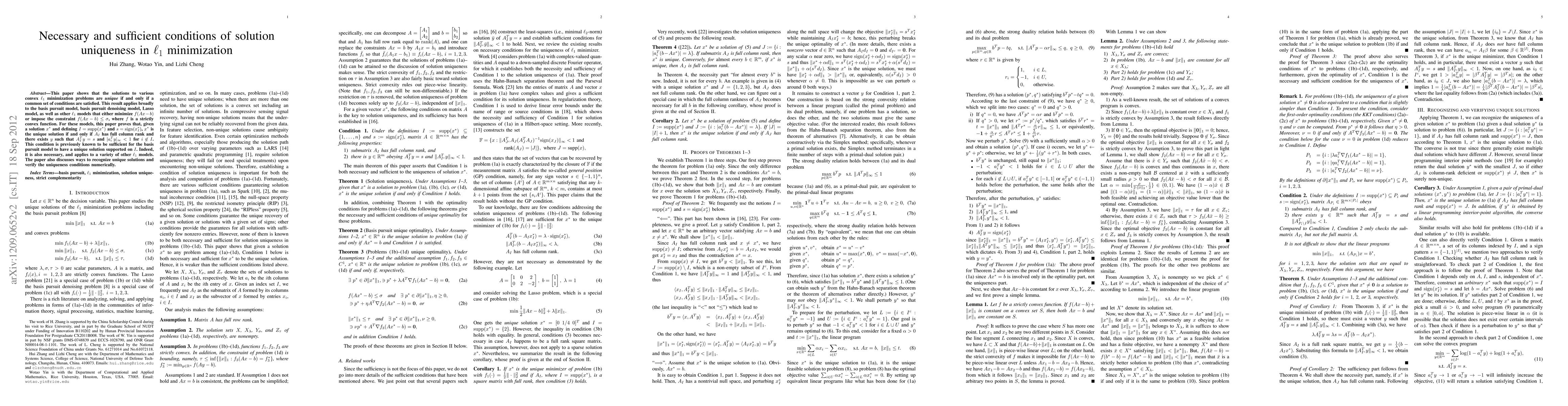 This paper establishes that the uniqueness of solutions in various convex $\ell_1$ minimization problems is guaranteed if and only if $A_I$ has full column rank and there exists a $y$ satisfying $A_I^Ty=s$ with $|a_i^Ty|_\infty<1$ for $i\not\in I$, where $I$ is the support of the solution. This condition is both necessary and sufficient for models like basis pursuit and Lasso.