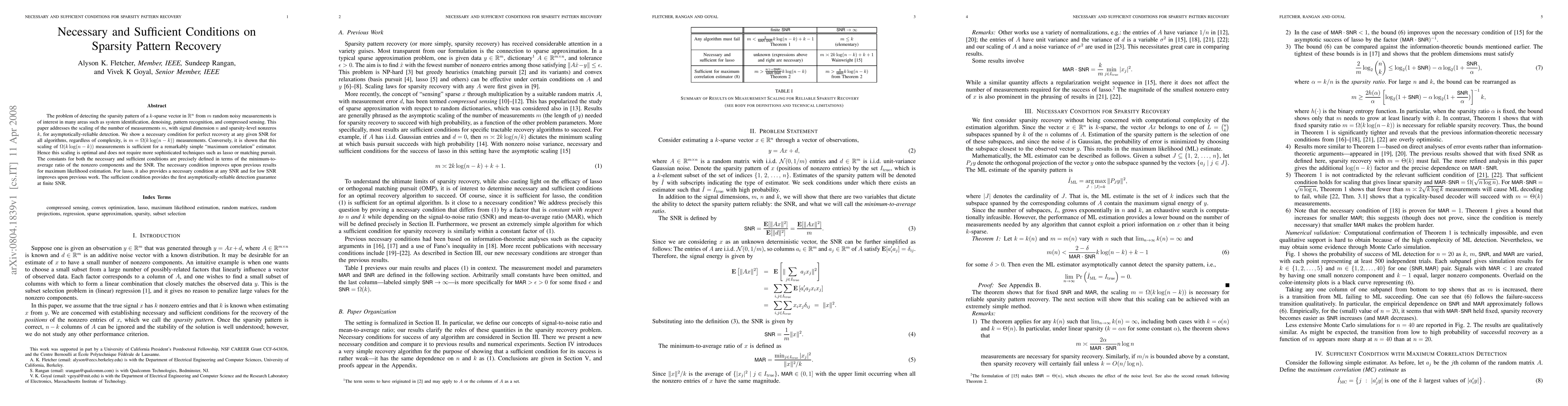 This paper establishes the optimal scaling of measurements required for detecting the sparsity pattern of a k-sparse vector in R^n, showing that m = Ω(k log(n-k)) measurements are necessary and sufficient for reliable recovery. It provides precise conditions for both necessary and sufficient recovery, improving upon previous results for maximum likelihood and lasso estimation.