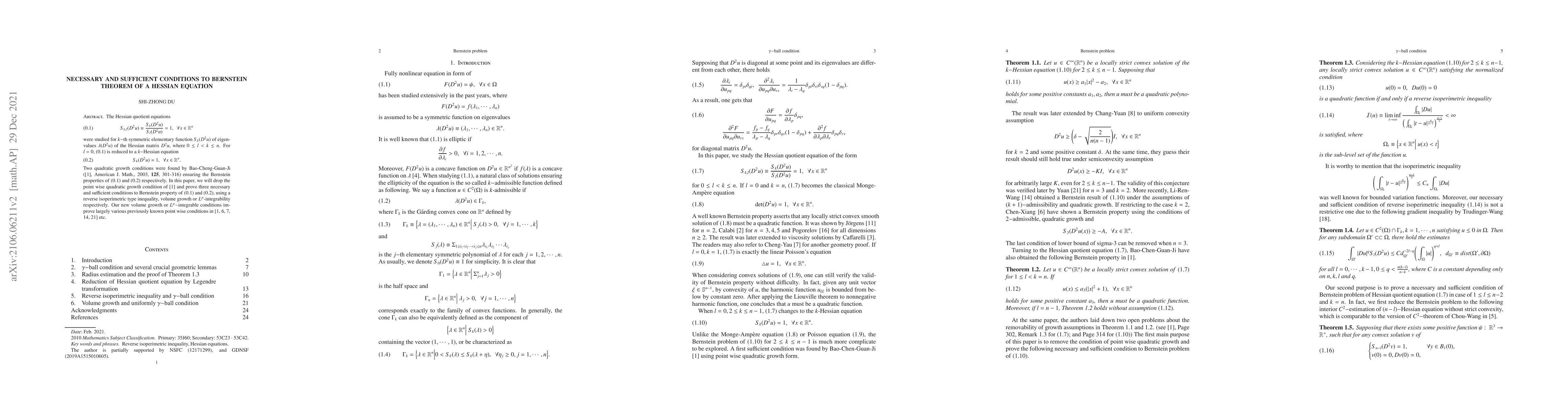 The Hessian quotient equatio were studied for k-th symmetric elementary function S_k(D^2u) of eigenvalues of the Hessian matrix D^2u. Two pointwise quadratic growth conditions were found by Bao-Cheng-Guan-Ji ([1], American J. Math., 2003, 125, 301-316) ensuring Bernstein properties of Hessian quotient equation or k-Hessian equation respectively. In this paper, we will drop the point wise quadratic growth condition of [1] and prove three necessary and sufficient conditions to Bernstein property of (0.1) and (0.2), using a reverse isoperimetric type inequality, volume growth or Lp-integrable respectively.Our volume growth or Lp-integrable conditions improve largely various known point wise conditions in [1,6,7,13,18] etc.