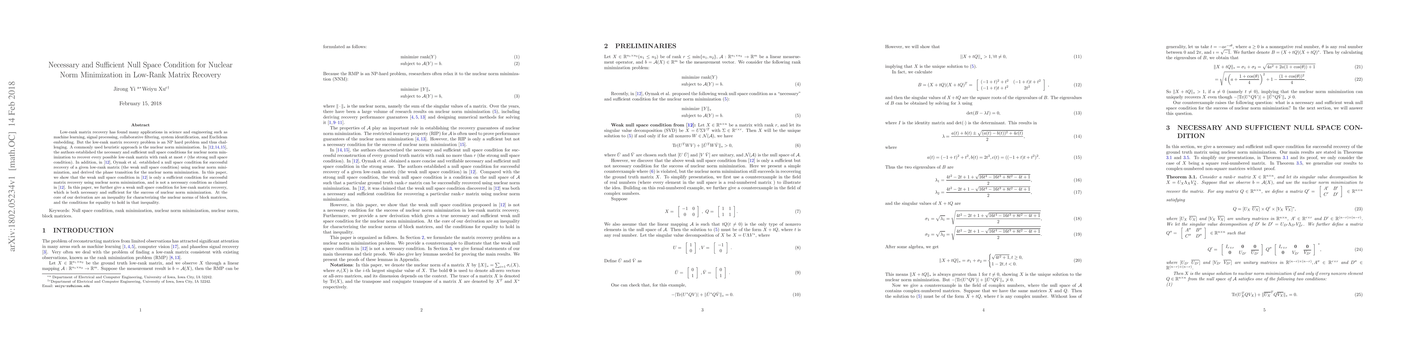 Low-rank matrix recovery has found many applications in science and engineering such as machine learning, signal processing, collaborative filtering, system identification, and Euclidean embedding. But the low-rank matrix recovery problem is an NP hard problem and thus challenging. A commonly used heuristic approach is the nuclear norm minimization. In [12,14,15], the authors established the necessary and sufficient null space conditions for nuclear norm minimization to recover every possible low-rank matrix with rank at most r (the strong null space condition). In addition, in [12], Oymak et al. established a null space condition for successful recovery of a given low-rank matrix (the weak null space condition) using nuclear norm minimization, and derived the phase transition for the nuclear norm minimization. In this paper, we show that the weak null space condition in [12] is only a sufficient condition for successful matrix recovery using nuclear norm minimization, and is not a necessary condition as claimed in [12]. In this paper, we further give a weak null space condition for low-rank matrix recovery, which is both necessary and sufficient for the success of nuclear norm minimization. At the core of our derivation are an inequality for characterizing the nuclear norms of block matrices, and the conditions for equality to hold in that inequality.