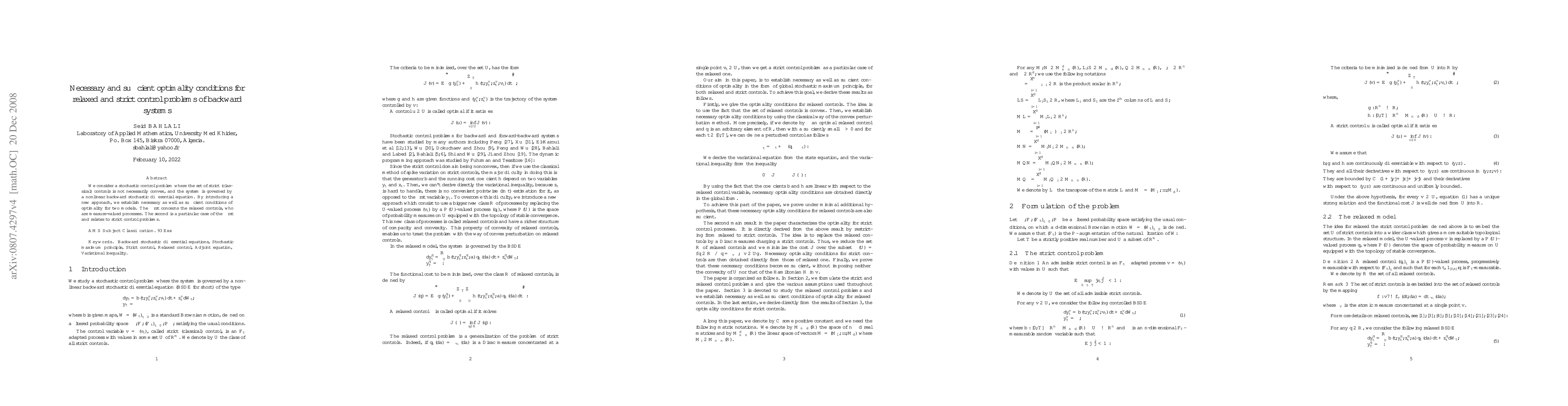 This paper establishes necessary and sufficient optimality conditions for both relaxed and strict control problems in stochastic systems governed by nonlinear backward stochastic differential equations, introducing a novel approach to handle non-convex strict control sets.