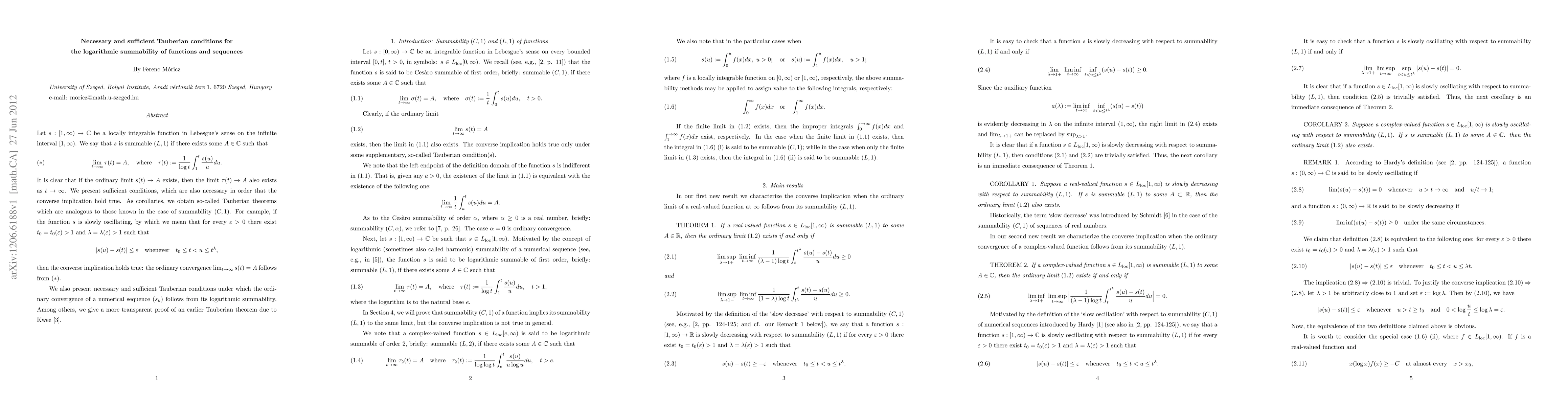 This paper presents necessary and sufficient Tauberian conditions for the logarithmic summability of functions and sequences. It introduces the concept of $(L,1)$ summability and proves that certain slowly oscillating functions exhibit the converse implication for ordinary convergence. Additionally, it provides conditions for the ordinary convergence of sequences based on their logarithmic summability, including a clearer proof of a prior theorem by Kwee.