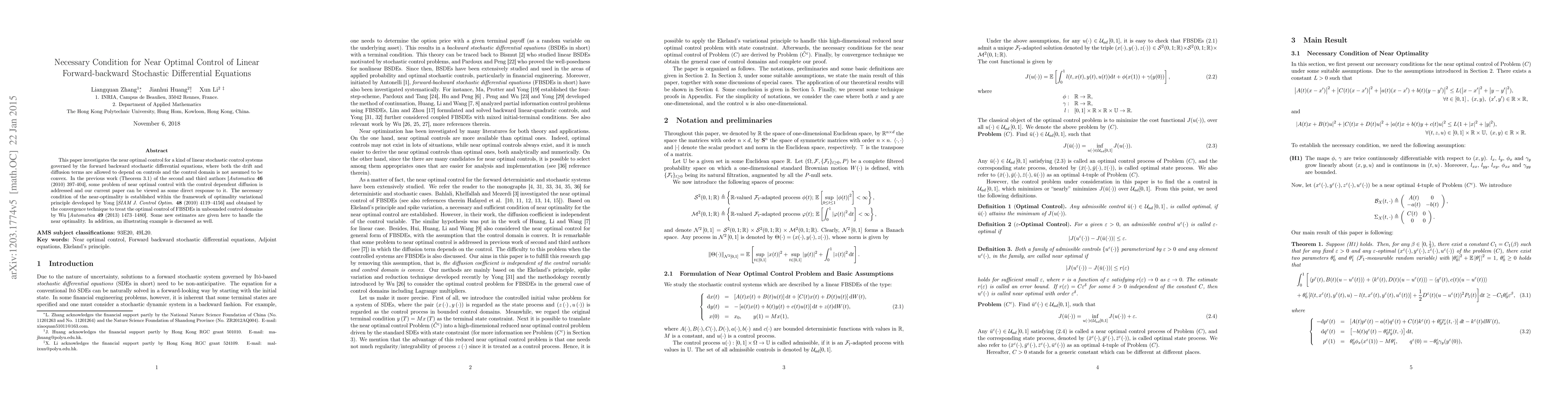 This paper investigates the near optimal control for a kind of linear stochastic control systems governed by the forward backward stochastic differential equations, where both the drift and diffusion terms are allowed to depend on controls and the control domain is not assumed to be convex. In the previous work (Theorem 3.1) of the second and third authors [\textit{% Automatica} \textbf{46} (2010) 397-404], some problem of near optimal control with the control dependent diffusion is addressed and our current paper can be viewed as some direct response to it. The necessary condition of the near-optimality is established within the framework of optimality variational principle developed by Yong [\textit{SIAM J. Control Optim.} \textbf{48} (2010) 4119--4156] and obtained by the convergence technique to treat the optimal control of FBSDEs in unbounded control domains by Wu [% \textit{Automatica} \textbf{49} (2013) 1473--1480]. Some new estimates are given here to handle the near optimality. In addition, an illustrating example is discussed as well.