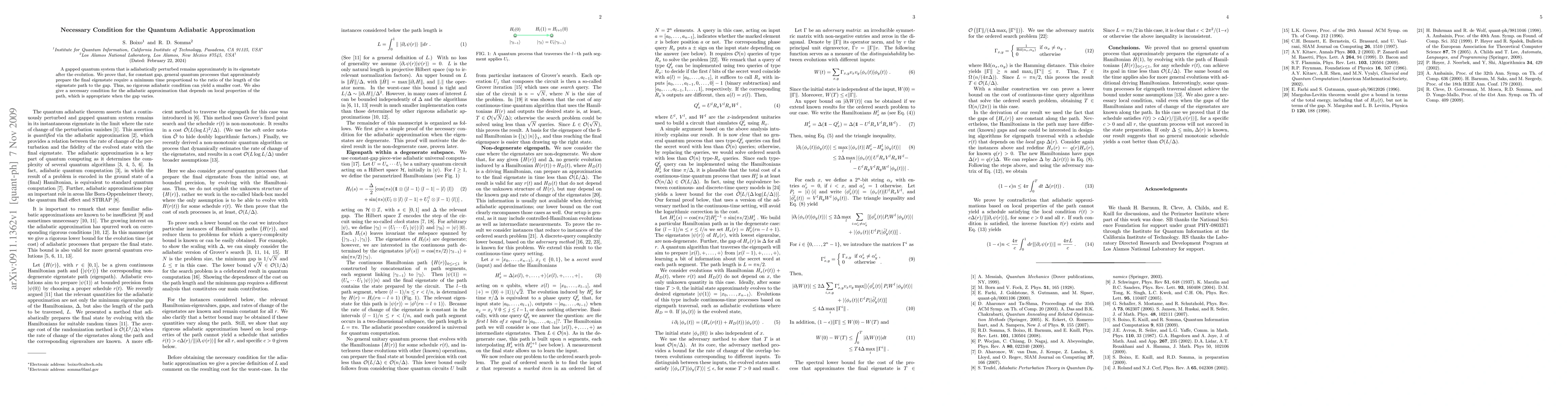 This paper proves that for a constant gap in a quantum system, any process that adiabatically prepares the final eigenstate must take a minimum time proportional to the eigenstate path length divided by the gap. It also provides a necessary condition for the adiabatic approximation based on local path properties when the gap varies.