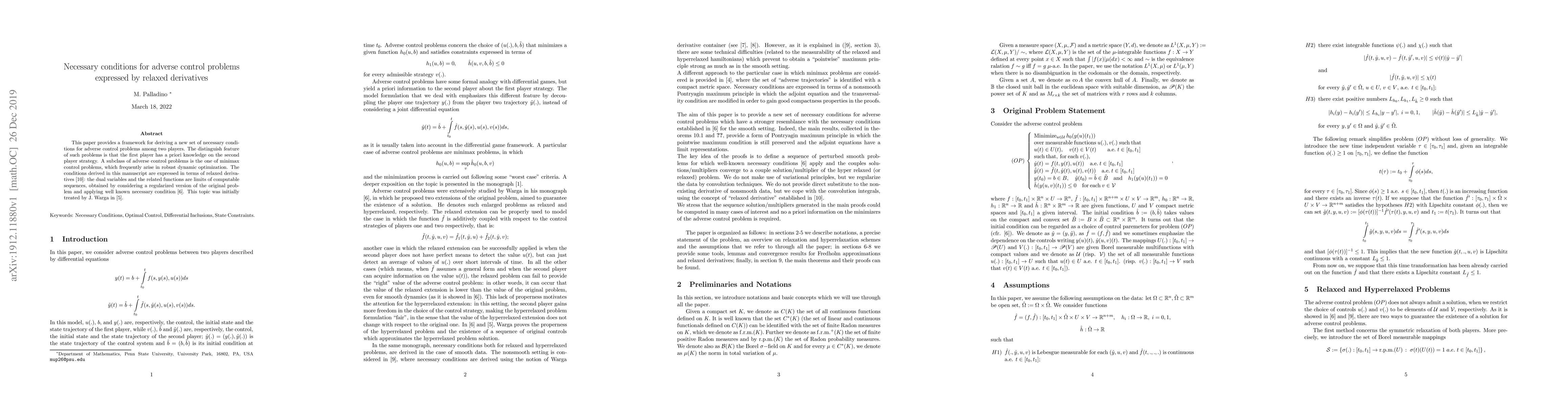 This paper provides a framework for deriving a new set of necessary conditions for adverse control problems among two players. The distinguish feature of such problems is that the first player has a priori knowledge on the second player strategy. A subclass of adverse control problems is the one of minimax control problems, which frequently arise in robust dynamic optimization. The conditions derived in this manuscript are expressed in terms of relaxed derivatives: the dual variables and the related functions are limits of computable sequences, obtained by considering a regularized version of the original problem and applying well known necessary condition. This topic was initially treated by J. Warga.