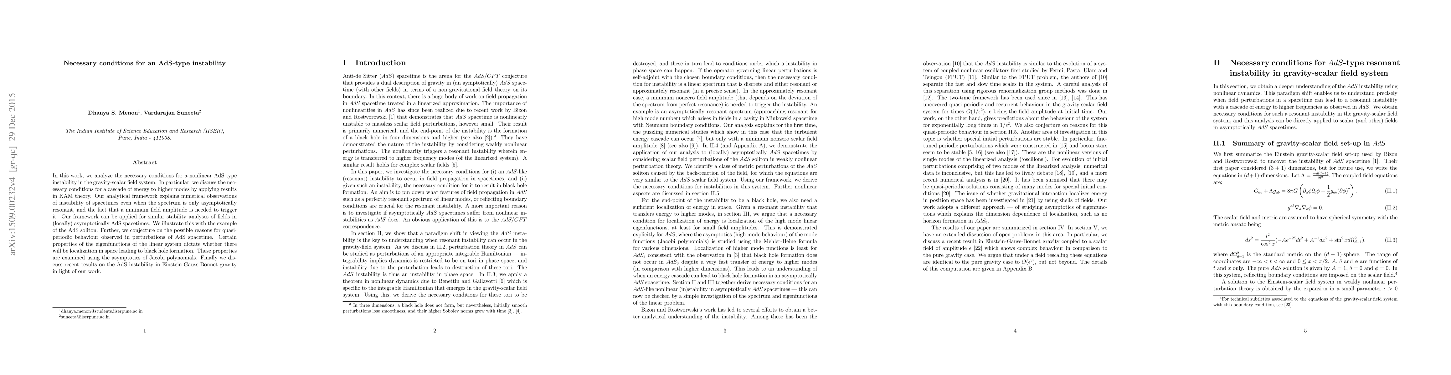 In this work, we analyze the necessary conditions for a nonlinear AdS-type instability in the gravity-scalar field system. In particular, we discuss the necessary conditions for a cascade of energy to higher modes by applying results in KAM theory. Our analytical framework explains numerical observations of instability of spacetimes even when the spectrum is only asymptotically resonant, and the fact that a minimum field amplitude is needed to trigger it. Our framework can be applied for similar stability analyses of fields in (locally) asymptotically AdS spacetimes. We illustrate this with the example of the AdS soliton. Further, we conjecture on the possible reasons for quasi-periodic behaviour observed in perturbations of AdS spacetime. Certain properties of the eigenfunctions of the linear system dictate whether there will be localization in space leading to black hole formation. These properties are examined using the asymptotics of Jacobi polynomials. Finally we discuss recent results on the AdS instability in Einstein-Gauss-Bonnet gravity in light of our work.