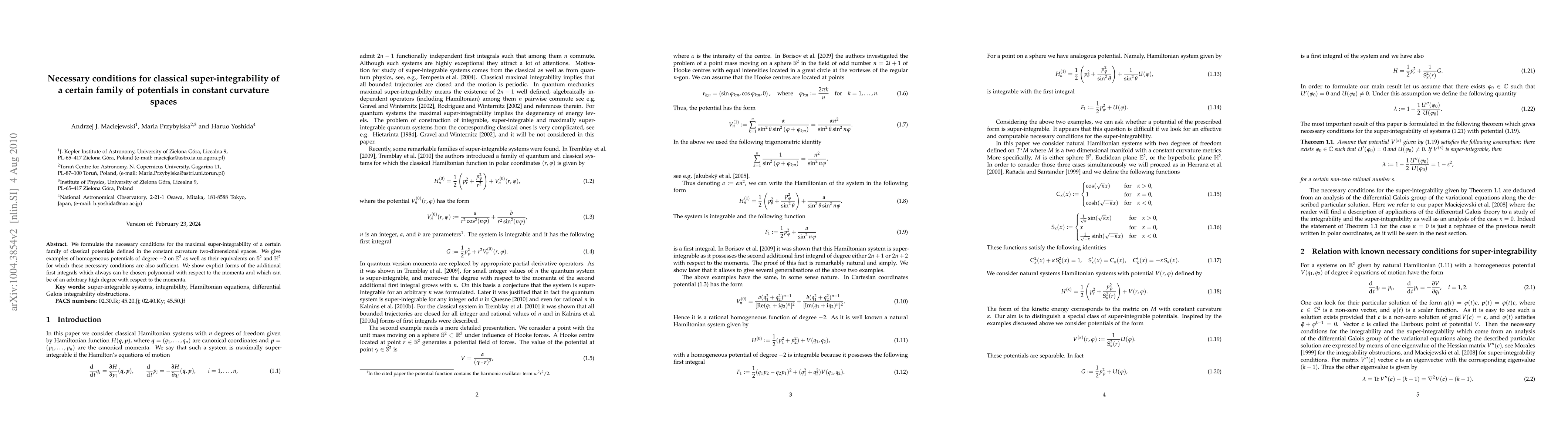 This paper establishes necessary conditions for the maximal classical super-integrability of a specific family of potentials in two-dimensional spaces with constant curvature. It provides examples where these conditions are also sufficient, including homogeneous potentials of degree -2 on Euclidean, spherical, and hyperbolic spaces.
