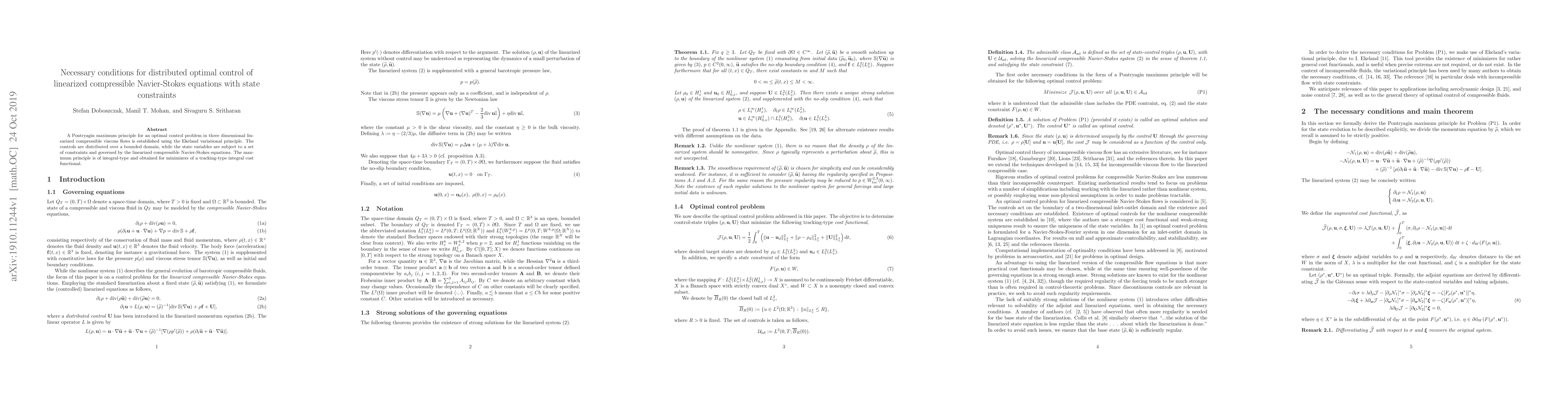 This paper establishes a Pontryagin maximum principle for distributed optimal control of linearized compressible Navier-Stokes equations, utilizing the Ekeland variational principle. The principle is integral-type and applies to minimizers of a tracking-type cost functional under state constraints.
