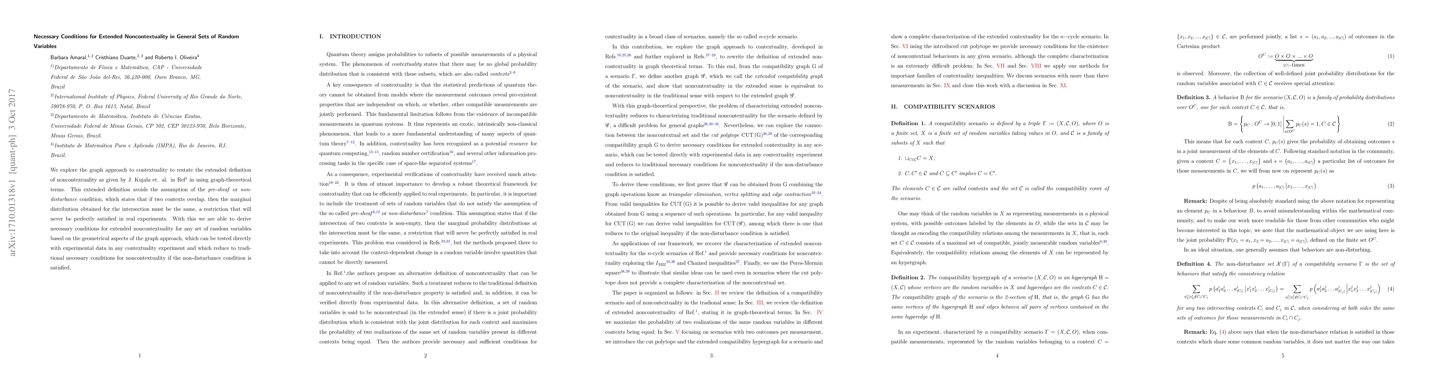 This paper reformulates the extended definition of noncontextuality using graph theory, eliminating the non-disturbance condition. It derives necessary conditions for extended noncontextuality based on graph geometry, which can be directly tested in experimental settings and revert to traditional conditions when the non-disturbance assumption holds.