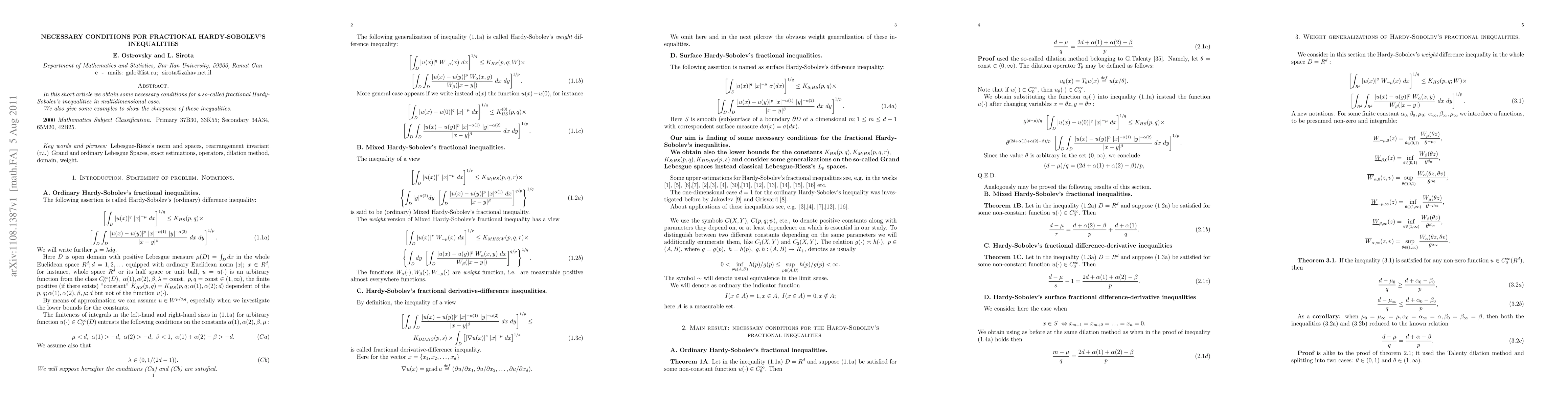 The paper employs the dilation method, originally attributed to G. Talenti, to derive necessary conditions for fractional Hardy-Sobolev inequalities in the multidimensional case.