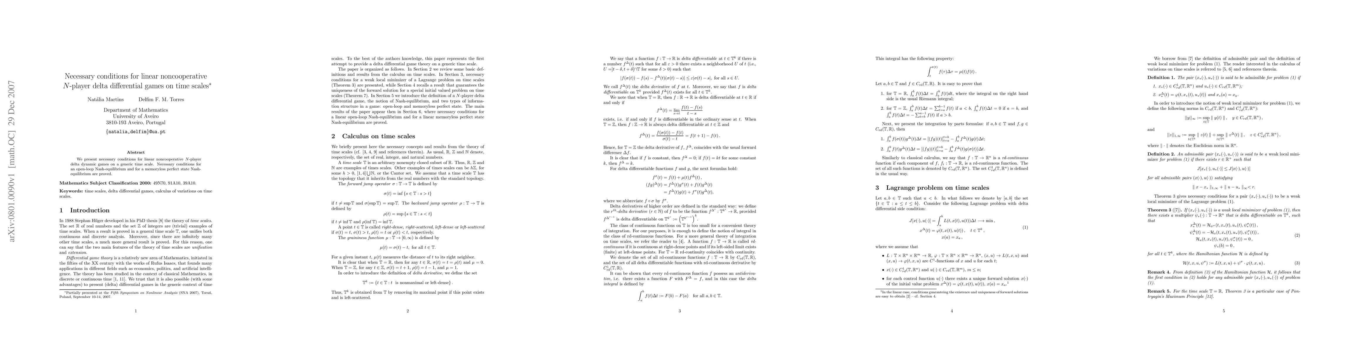 This paper establishes necessary conditions for linear noncooperative N-player delta dynamic games on time scales, proving conditions for both open-loop Nash-equilibrium and memoryless perfect state Nash-equilibrium.